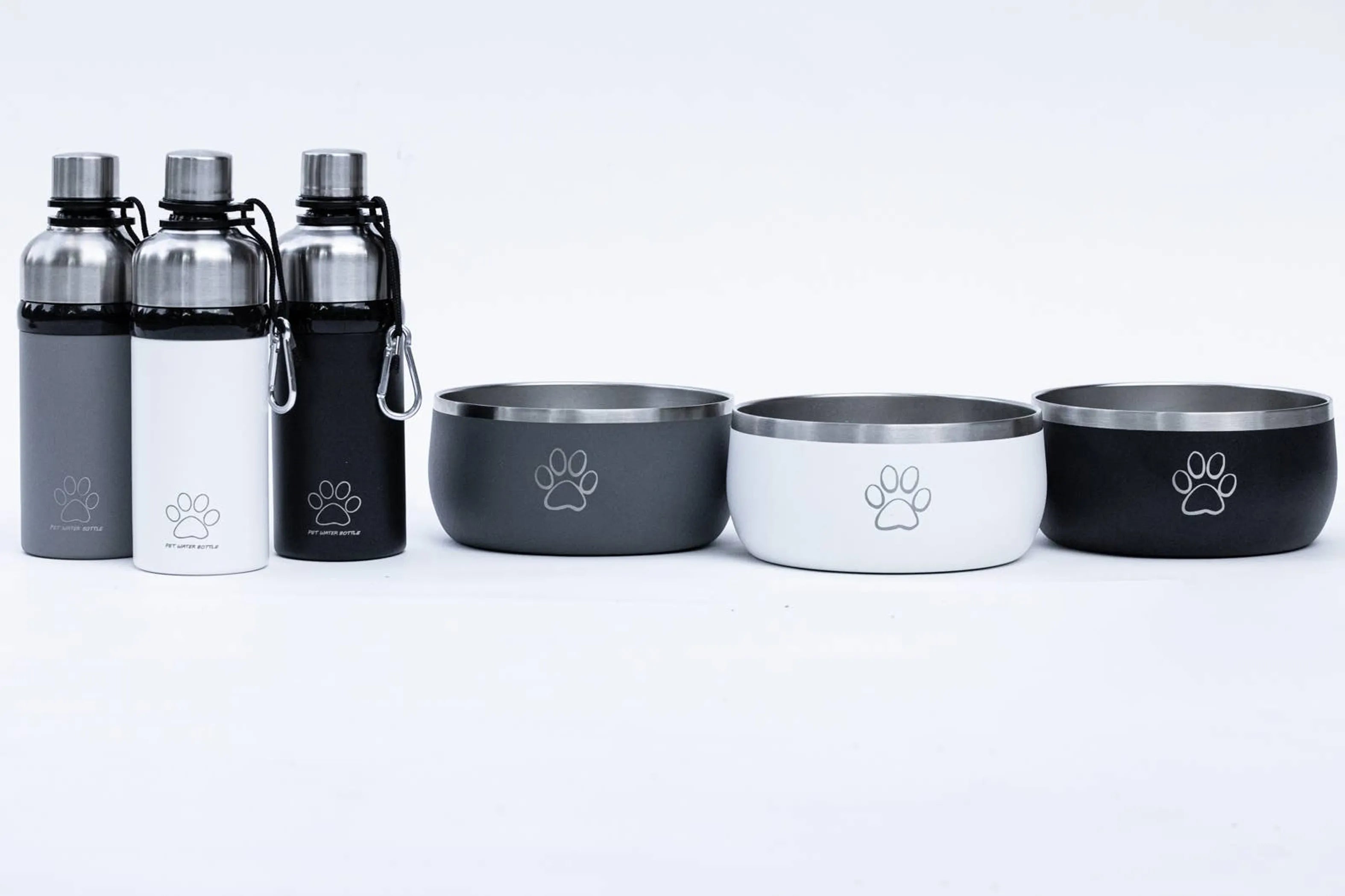 Featuring our durable, patented, BPA-free and stainless steel water bottle and bowl, the set comes in 3 finishes: