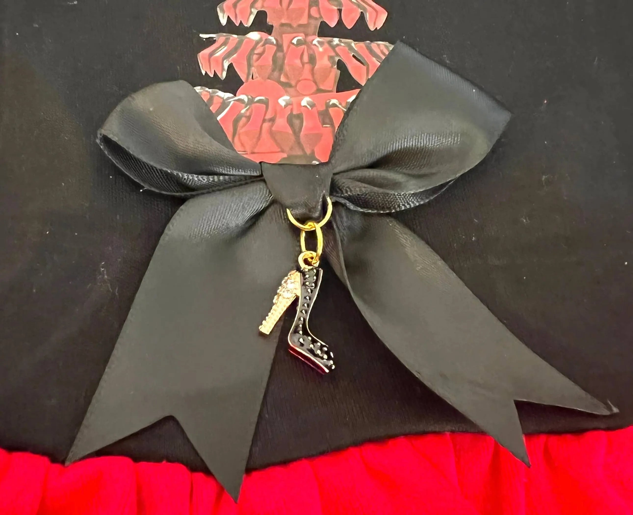 Adorable cotton dress featuring a "Loubarkin" Shoe tree with a rhinestone star and black satin bow.