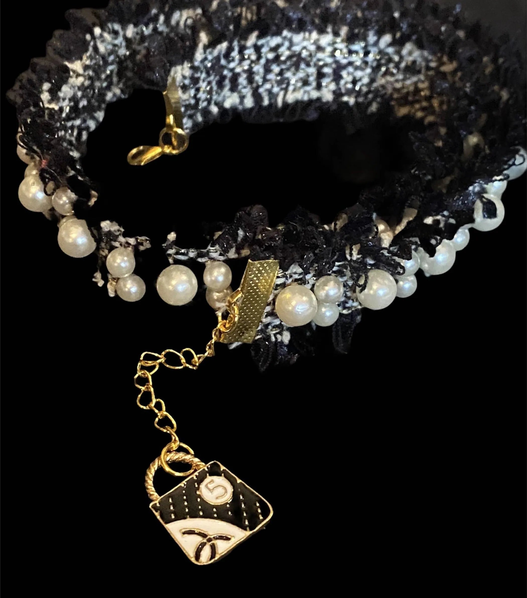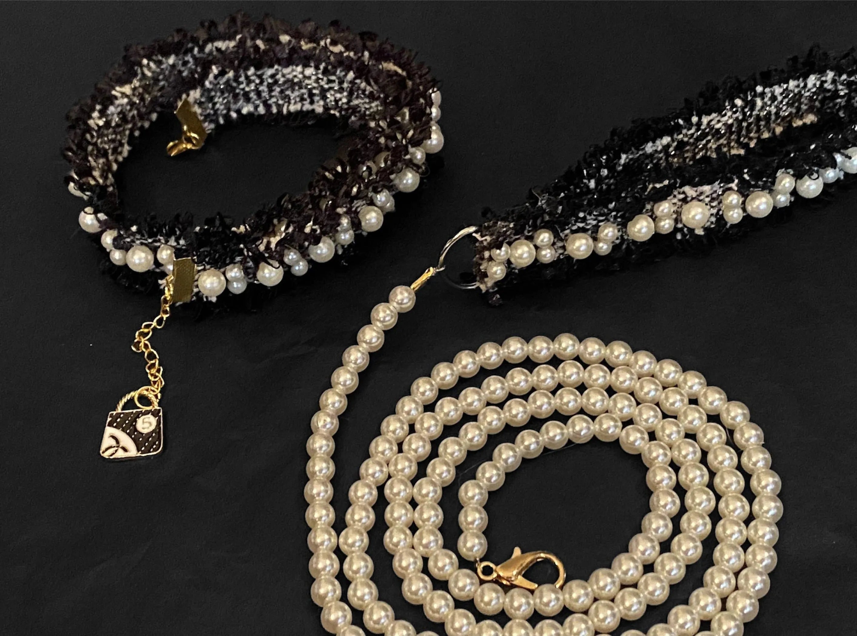 Luxurious Pearl & tweed collar ? Essential item for fashionista pooches! ? Pair with our Luxurious Pearl and tweed collar and bows! XS: 8in Small: 12in. Medium: 16 in. Large: 18 in. XL: 20 **We are happy to adjust the sizing should you need to. Please just leave notes at checkout**