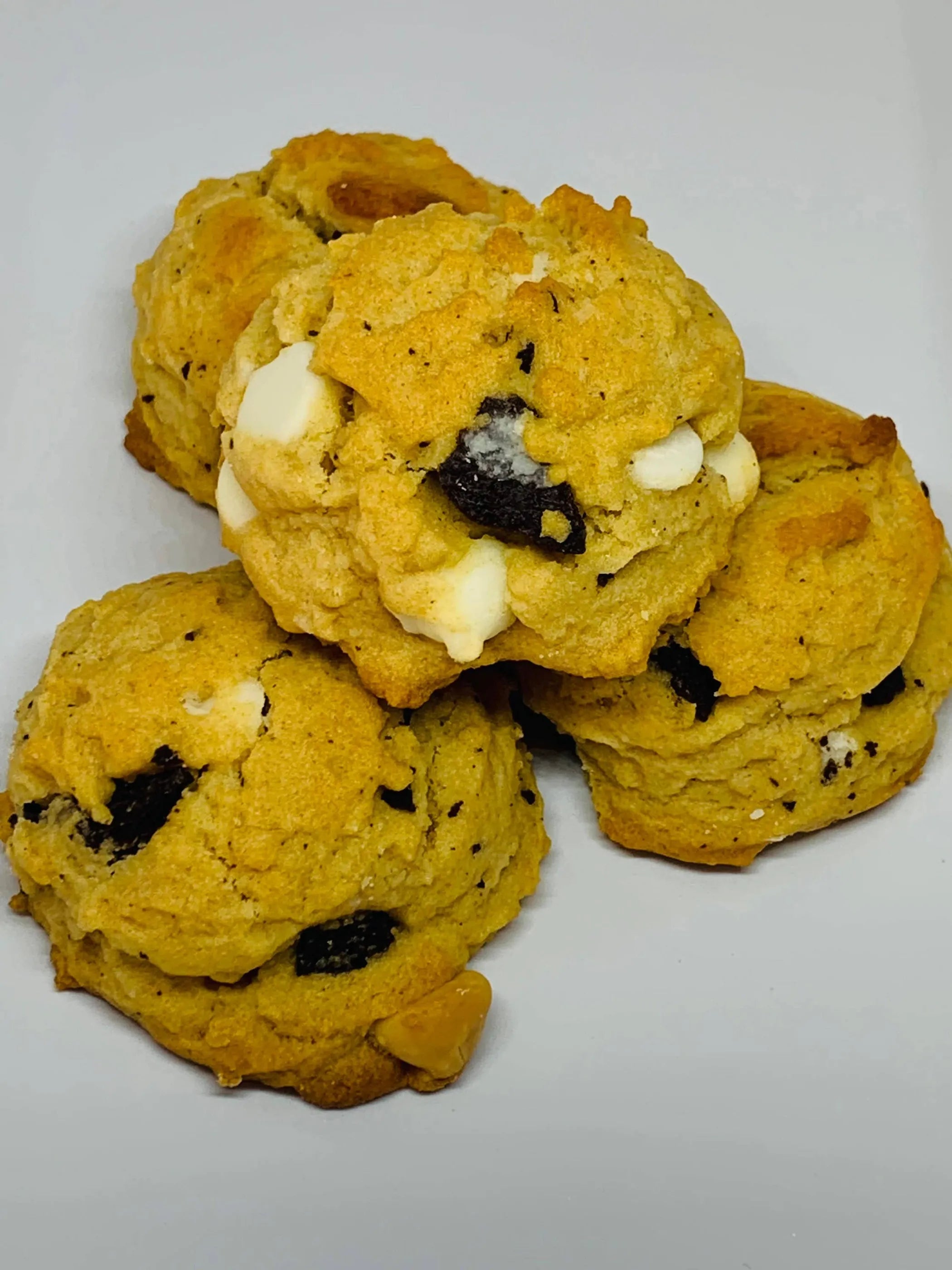 Sweet honey cake ball with creamy white vanilla chips and carob oreo chunks inside. All new flavor!