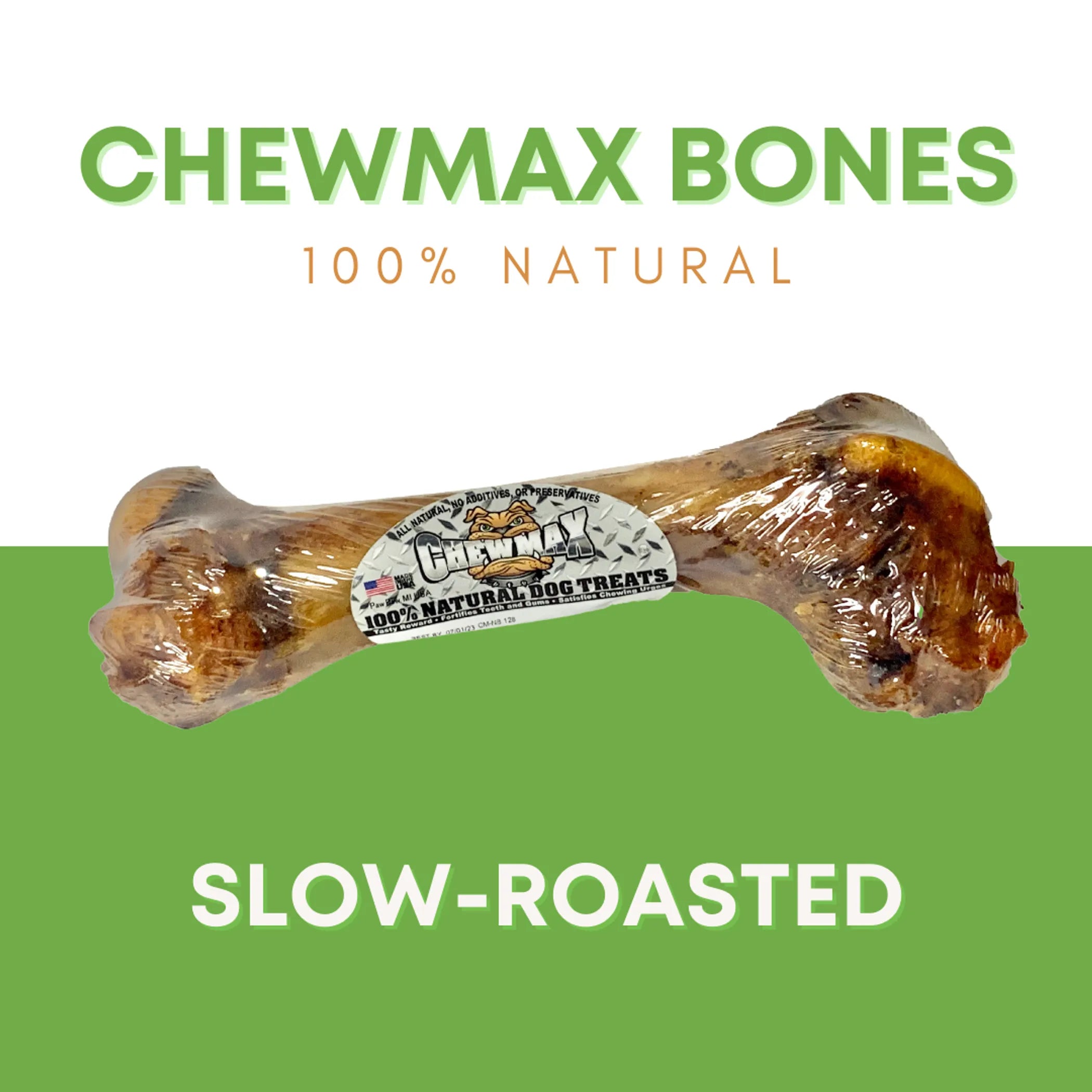 Chewmax Pet bones are cleaned through a natural, proprietary process, rather than using bleach or other harsh chemical. Then, the bones are slow-roasted to perfection in their natural juices, free of added chemical and preservatives. Made in the USA