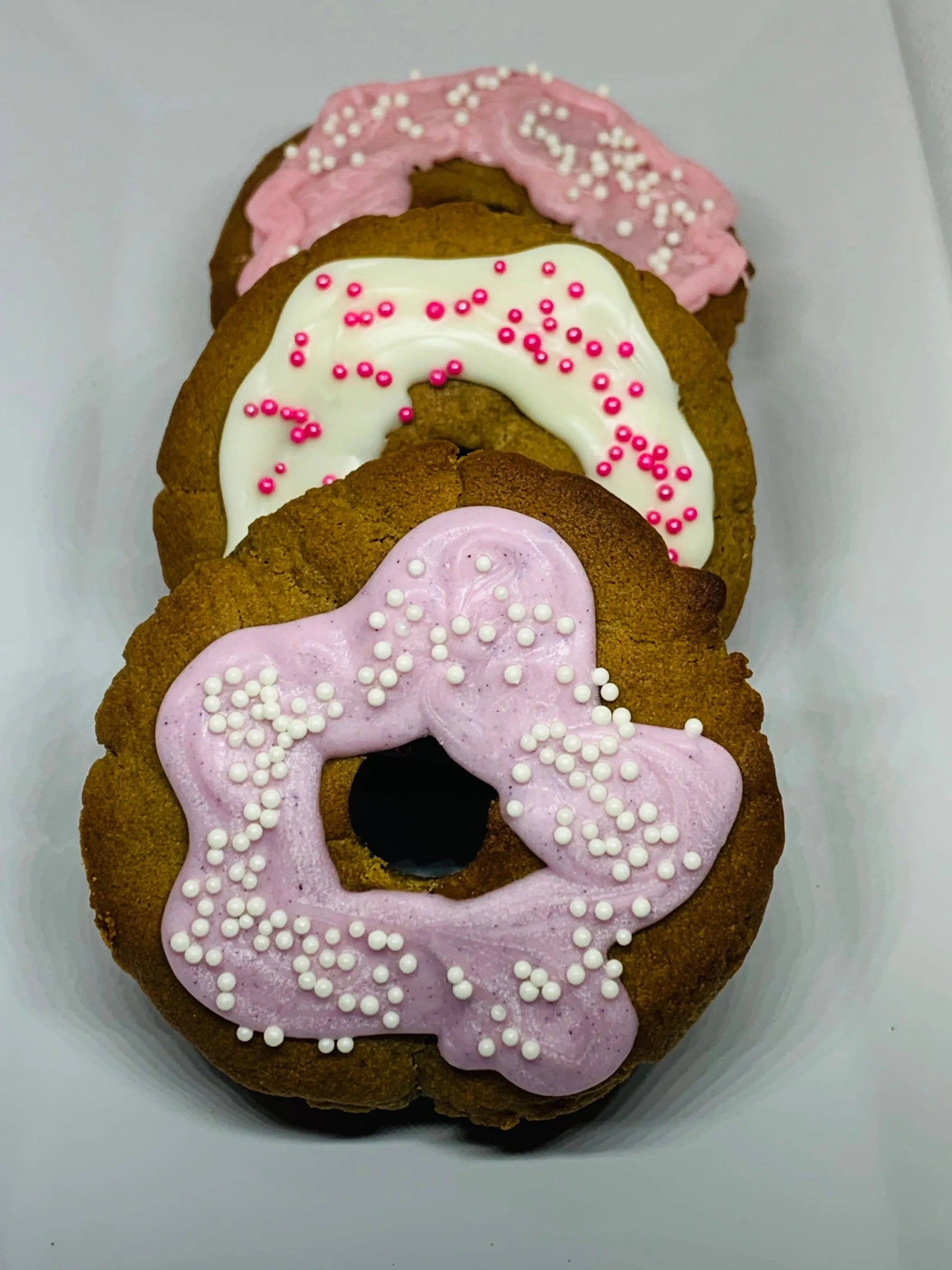 Yummy, chewy/crunchy carob donut baked with peanut butter chips tucked inside and drizzled with different colored vanilla icing and sprinkles on top. These donuts are the same size that we humans like to eat. Sprinkles color subject to change per season/holidays.