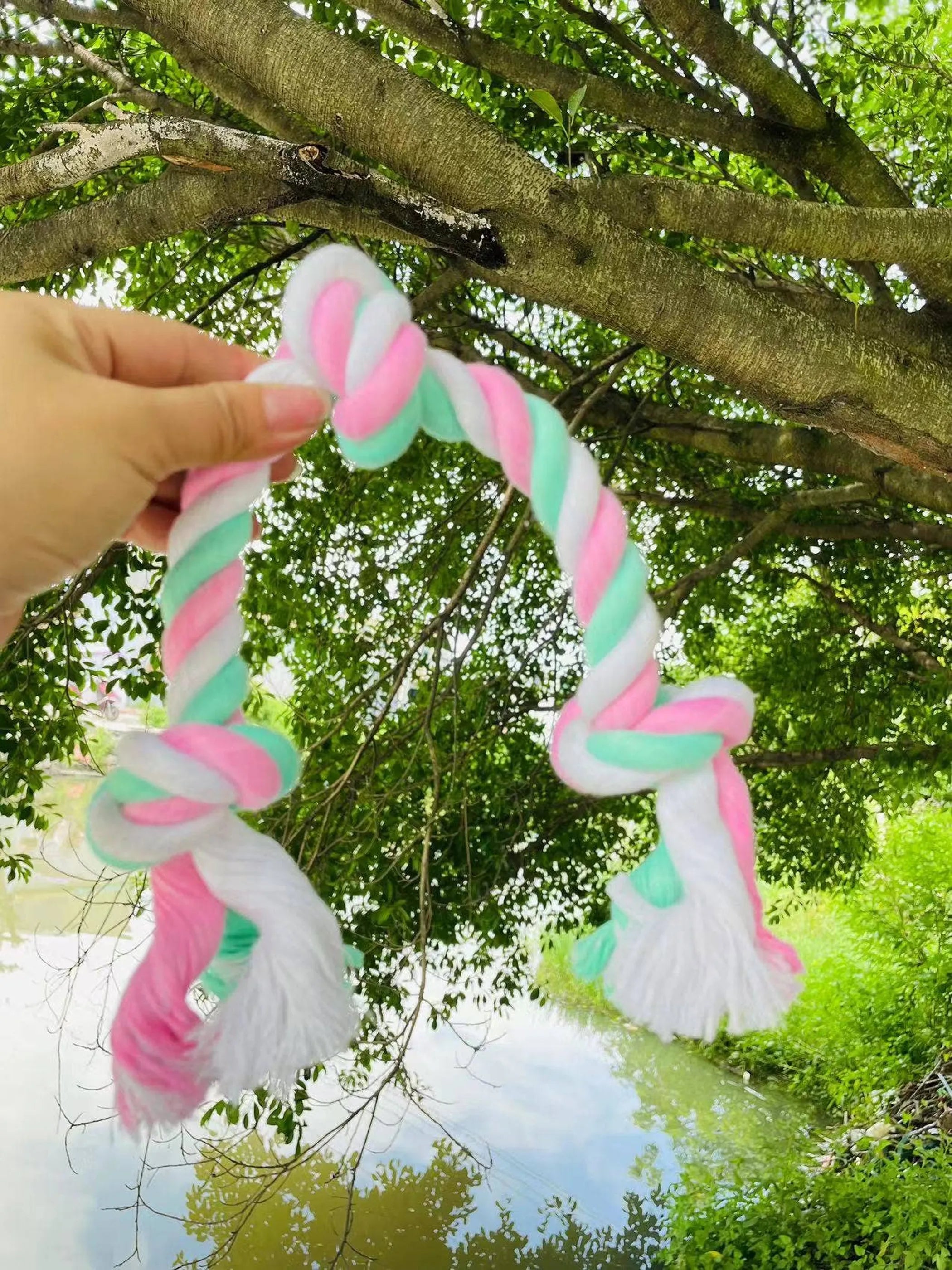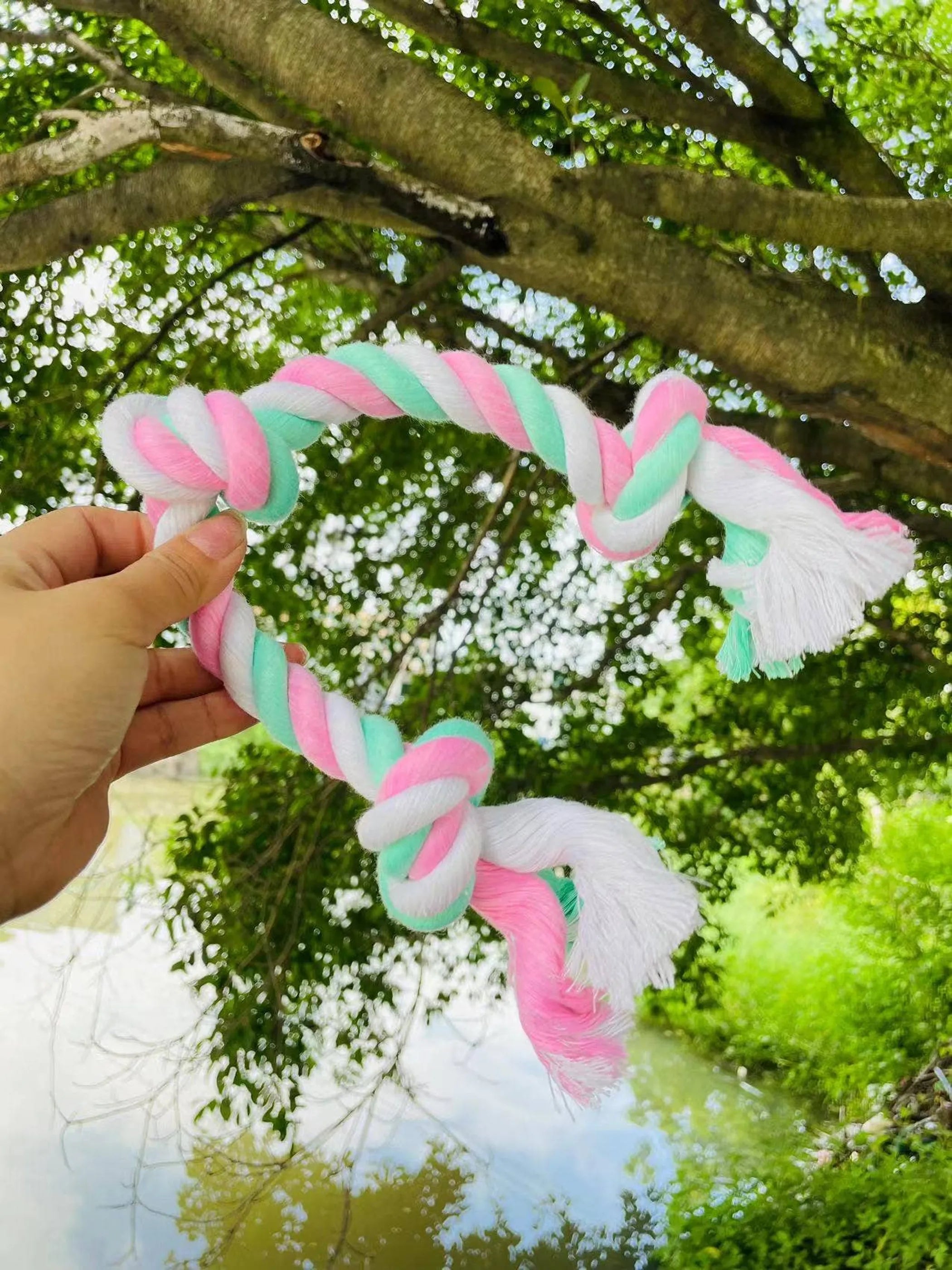 The 3-Knot Rope can be used for interactive play or as a solo dog chew! These 100% sustainable cotton ropes are a fun and easy way to floss dog's gums and help prevent bad breath and dental issues.