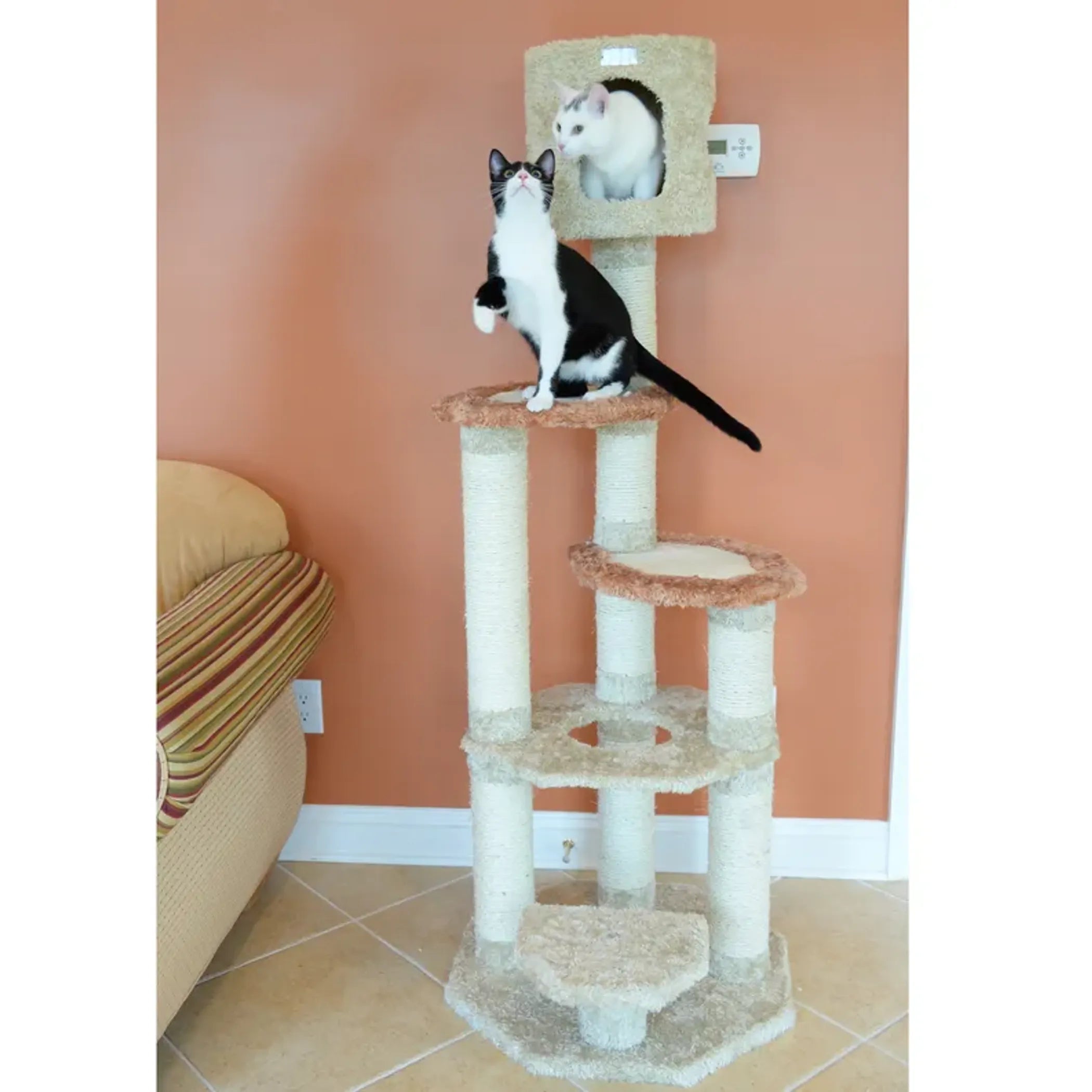 66 inch height, Multi-level cat tower in KHAKI Soft Heavy-Carpet, soft and durable carpet last years of activity.