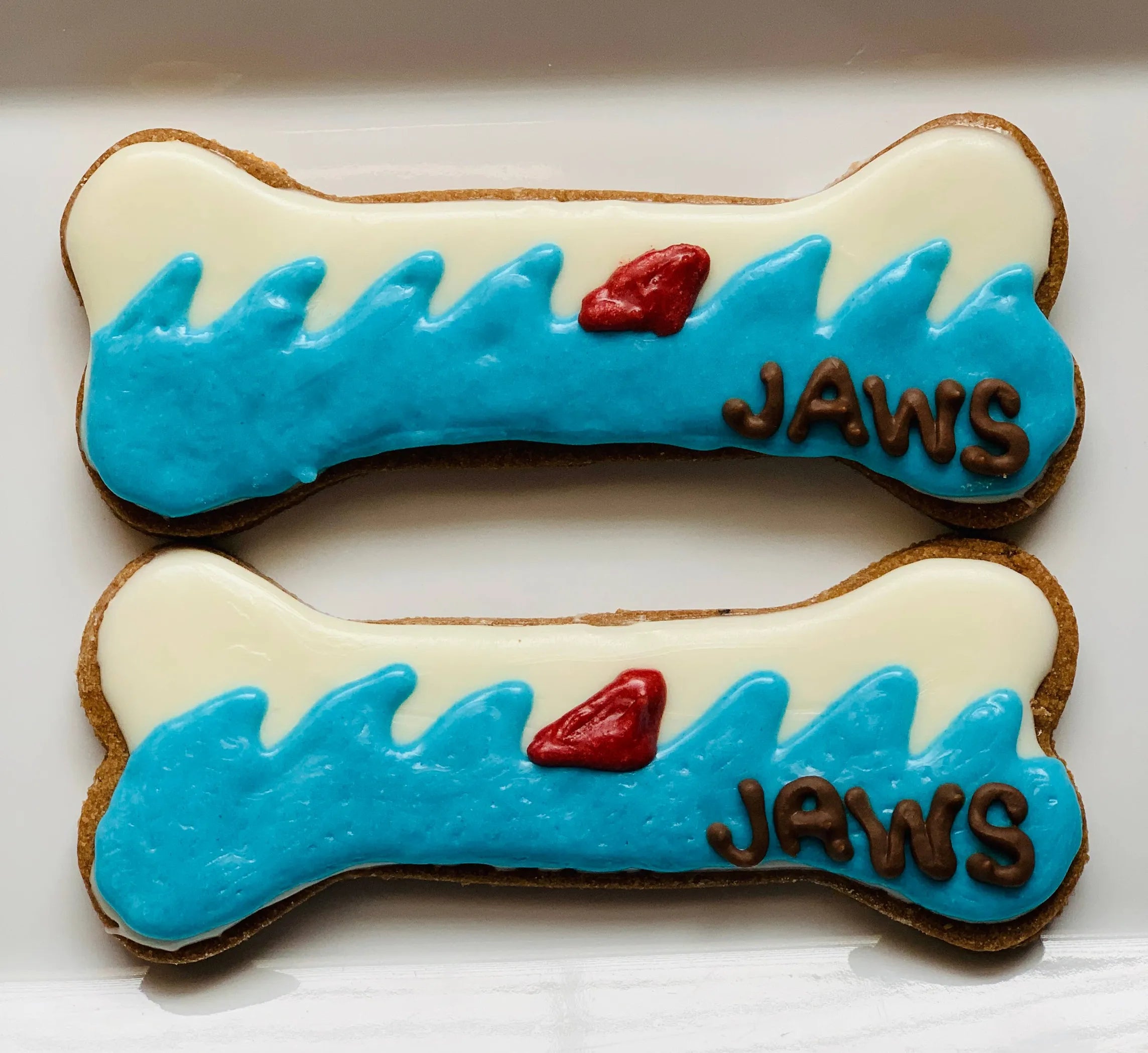 I think you're gonna need a bigger boat with this yummy carob bone shaped cookie decorated with white, red and blue vanilla icing and has Jaws written in carob icing.