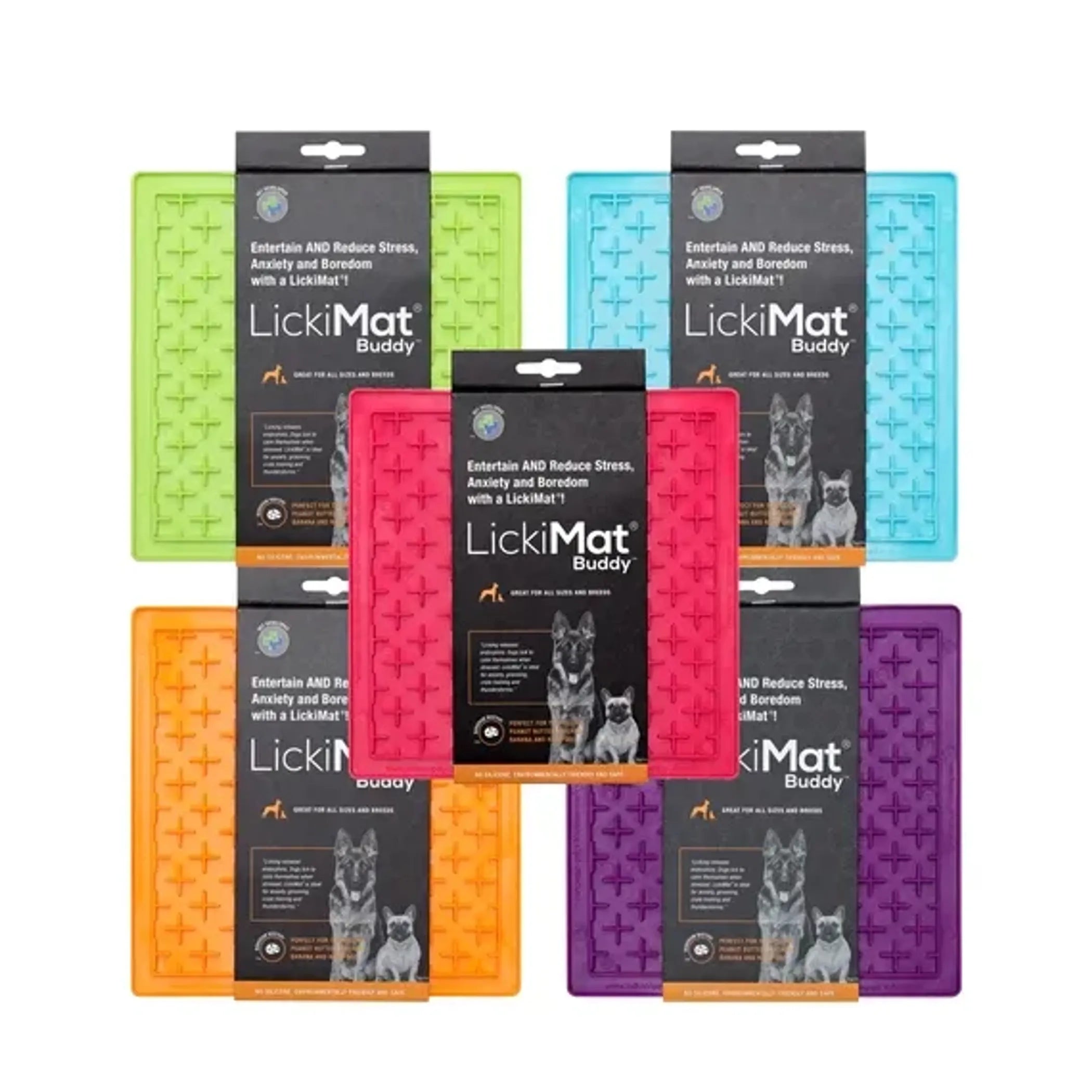 For fun pet interaction three designs are available. Lickimat Buddy, with its cross maze design, is perfect for trapping chunky treats like mushy meat or fish.