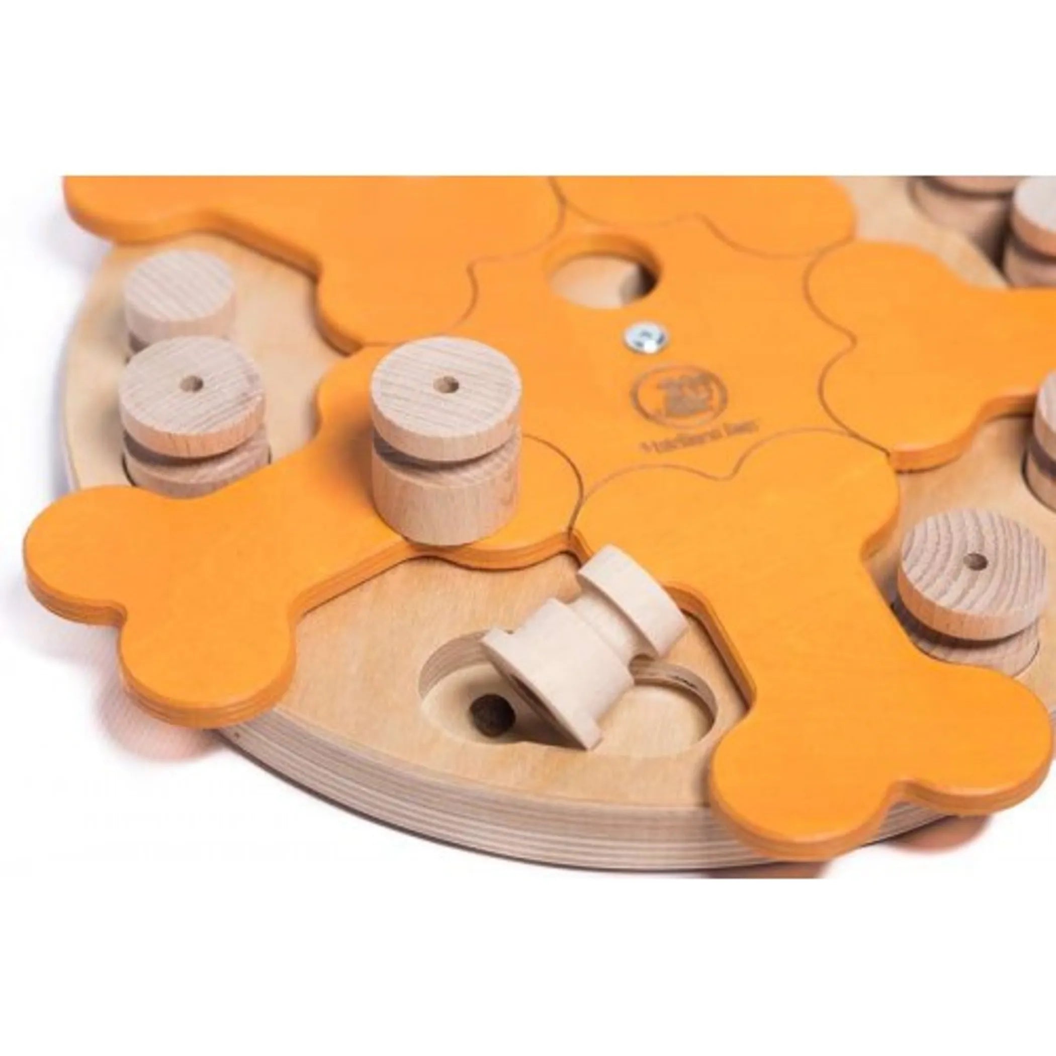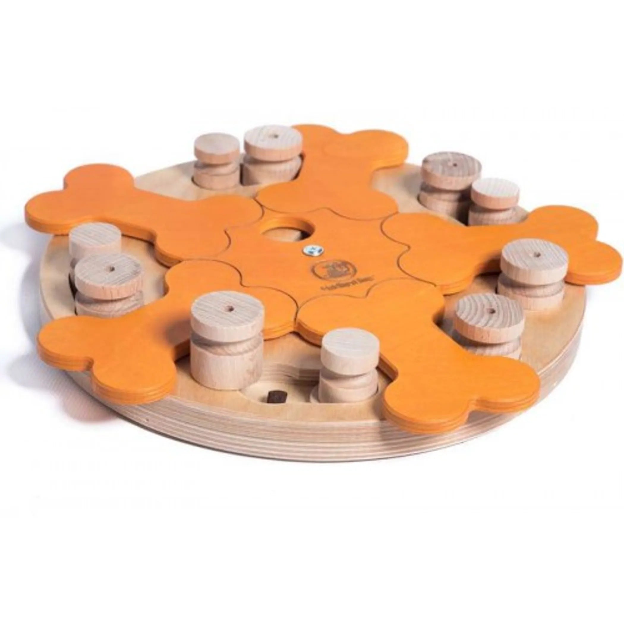 Length: 11.00 Width: 11.00 Height: 2.00 Carousel of bones This fun game in a form of disk adorned by bone-shaped movable platform, where tasty treats are hidden. We consider this puzzle as a step for more challenging games in your journey to unleashing a genius within your pet. It's one of favorite games of pet trainers and veterinary professionals alike. With 10 bricks (hats and cylinders) included in this game and additional hiding places for goodies that can be exposed, this game is a real treat for both a parent and his pet! According to dog's behaviorists 10 minutes of mental stimulation with employment of interactive game equivalents to 1 hour of physical exercise. This is especially important for the dogs living in large cities where long walks are difficult and impossible , senior dogs with ailments that do not allow them for prolong outings and those living in cold climates where going outside can put animal's health at risk. How to play: 1. Hide your dog's favorite treat in various places (under "hats" and "cylinders", inside of the indentations under the" bone carousel". Make sure your pet observes you while you are doing it. 2. Encourage verbally your dog to look for the hidden treats. 3. The treat will be found under the "cylinder" by knocking it down with a paw or a nose and in case of the "hat" by moving it in its track to the position where the "hat" can be lifted revealing the treat. Additional drawers can be opened by pulling on the string attached to them. 4. Make sure to praise your dog each time he/she finds a treat. Additional information: Dimensions: 14"x14"x2" Weight: 3lb All our games and puzzles are made from certified wood covered with water-based varnish that is not harmful to humans and animals. Please keep the game dry and free of water exposure, as the wooden pieces may swell otherwise. Use only dry treats for playing with our games Keep out of reach of small children since removable parts can be a choking hazard to them