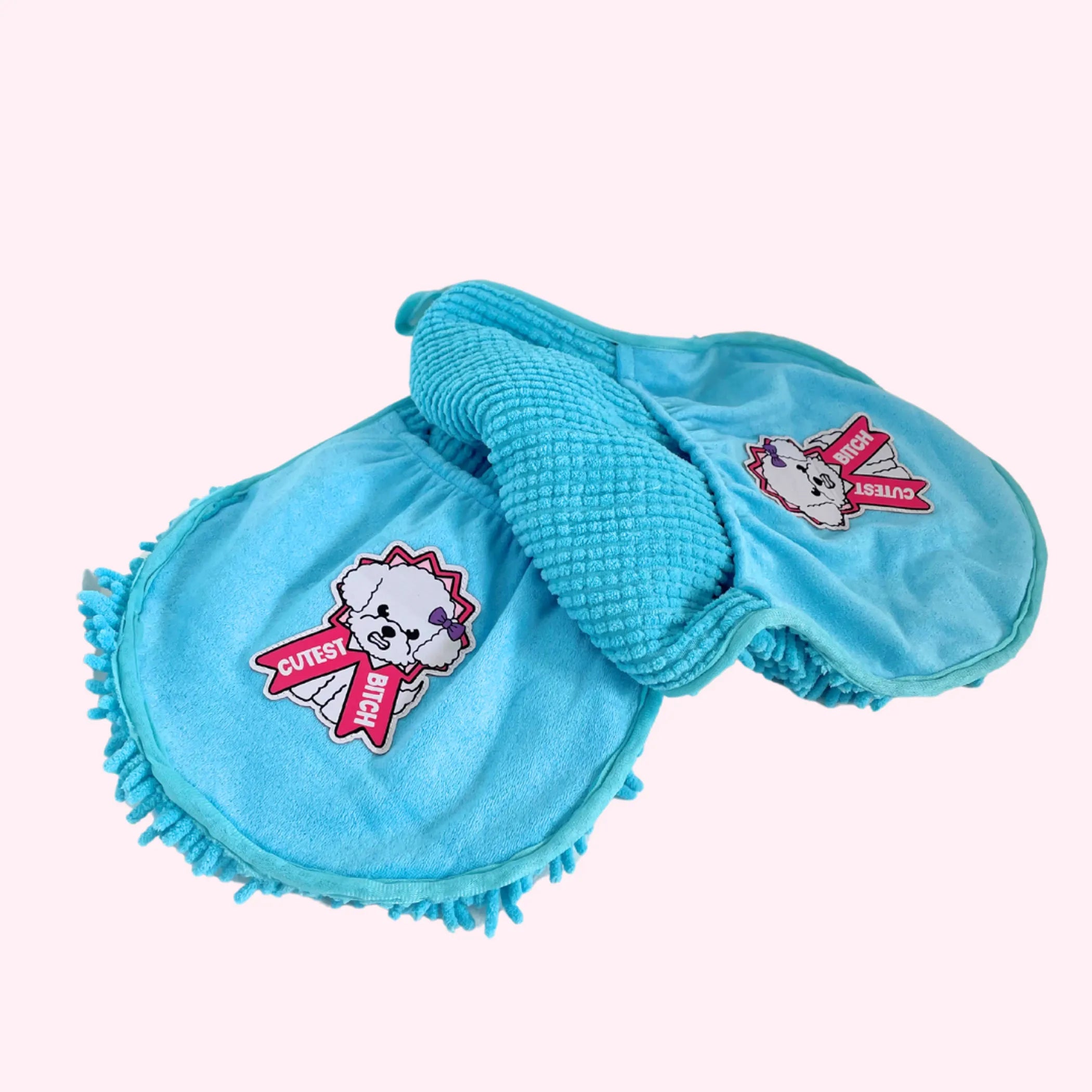 The "Cutest Bitch" pet towel is made to make drying your pet enjoyable and easy. With two pockets for your hands, you may comfortably hold your pet in place while drying them off.