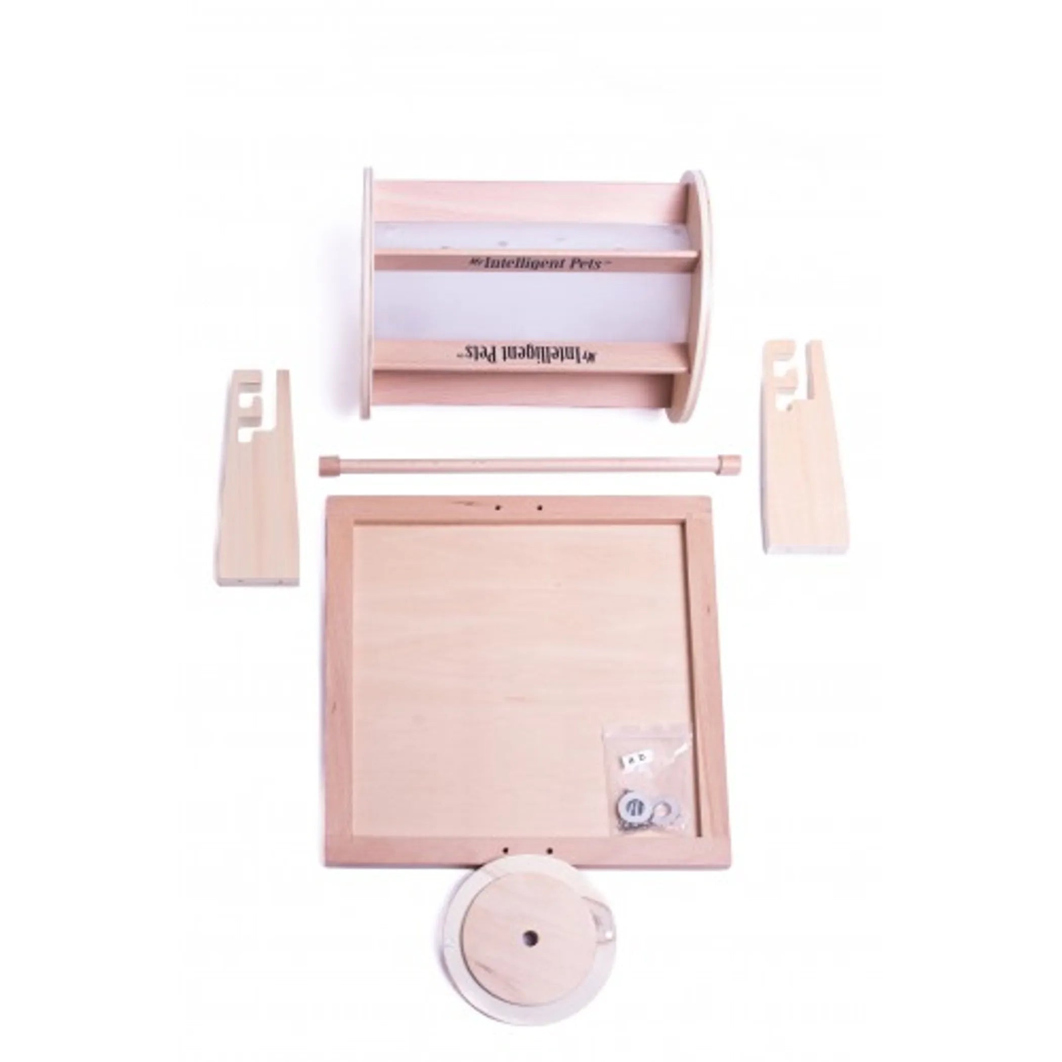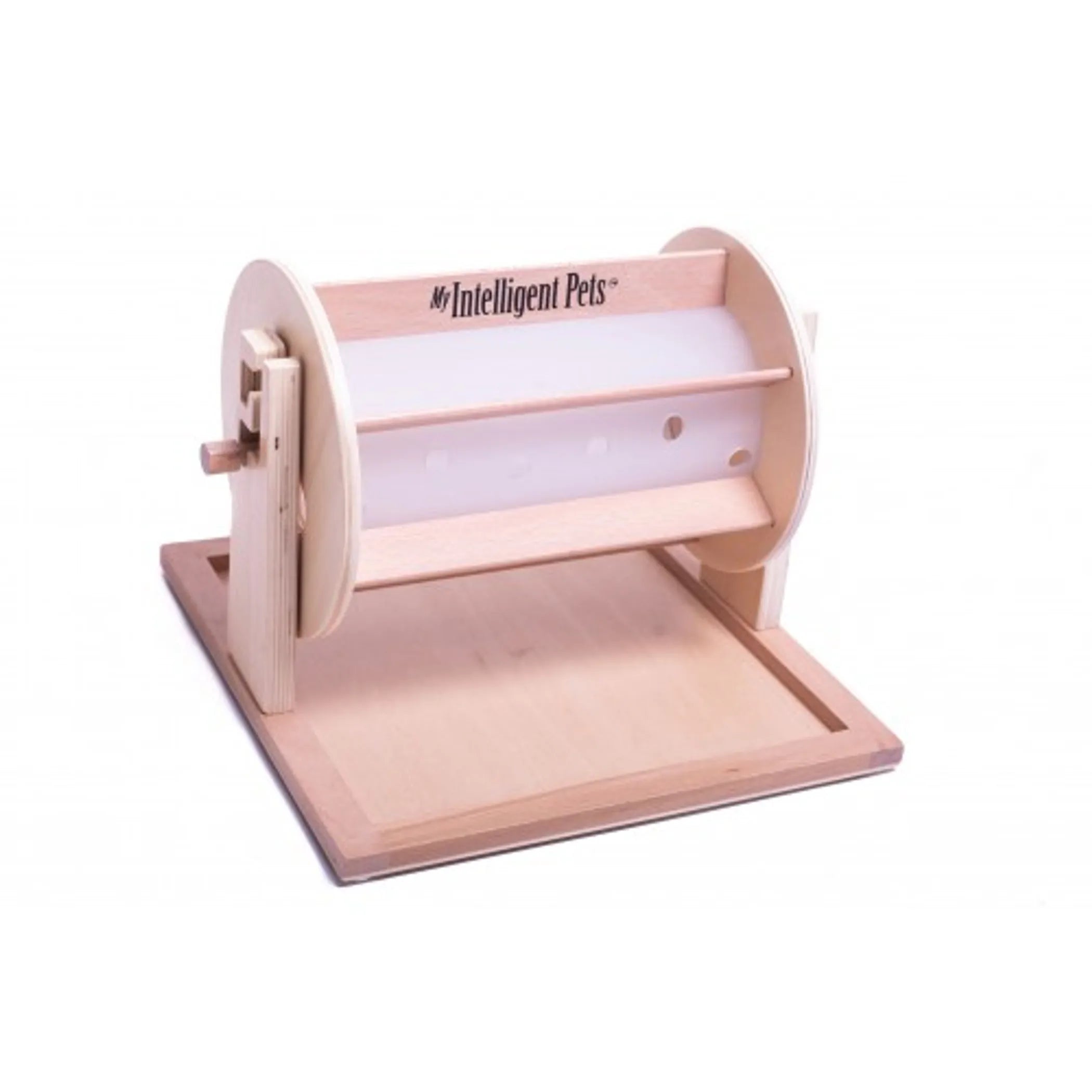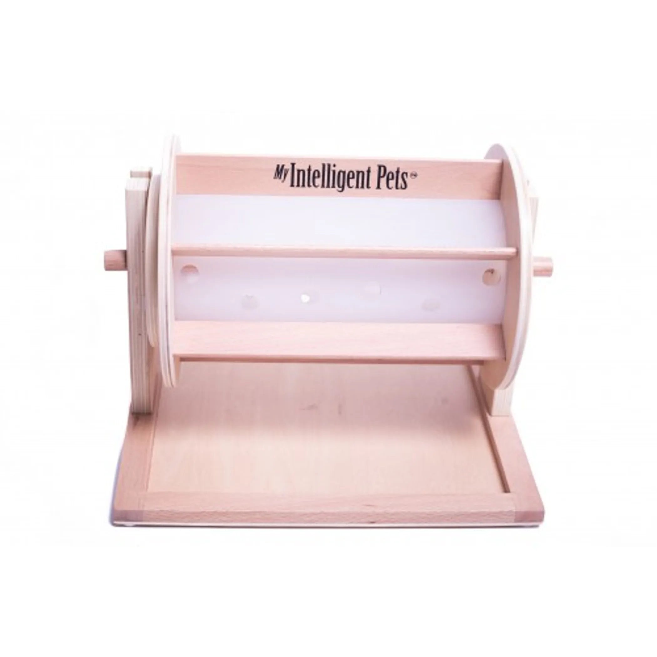 Pet's Fortune Wheel The Pet's Fortune Wheel poses a new challenge for your dog. Unlike flat board games, in which the dog/cat e.g. has to move pieces with his nose or his paw to get a reward, the Pet's Fortune Wheel requires your pet to spin the wheel vertically. The cylinder has four segments separated by thin wooden walls and each segment has holes. Three segments have holes with a diameter of about 10 mm (they will not let the recommended treats fall out) and in one segment holes have a diameter of about 12 mm - they are big enough to let the treats recommended by My Intelligent Pets(R) get through. Once the wheel turns, treats fall out. There is an opening on the side of the cylinder which is used to refill the wheel with treats. Size of the treats should be carefully selected so that they can easily fall out through the bigger holes. Here's how it works: Step 1 Open the lock located on the side of the cylinder. Fill the empty space with a handful of treats and close the lid. Step 2 Encourage your dog by spinning the wheel - with his nose or his paw - to play the game, so that he can get the reward. Step 3 Praise your dog each time he manages to get a treat out of the wheel. Hints You can increase the difficulty level of the game by sealing some of the holes with a duct tape. Play with your dog and encourage him to solve the task. Stay calm, be patient and continue to explain the game to your dog until he understands it. Do not let your dog play unsupervised and intervene when he starts to bite the game. Let your dog play with the game no longer than 10 minutes, otherwise he might lose his interest in the game. Distract him with something else and put the game away for a little while. A few days break from Dog's Fortune Wheel and playing with other games from My Intelligent Dogs(R) games collection will let your dog enjoy the Dog's Fortune Wheel game anew each time you give it to him. Suitable treats Please use only dry treats. The diameter of treats should be below 12 mm.