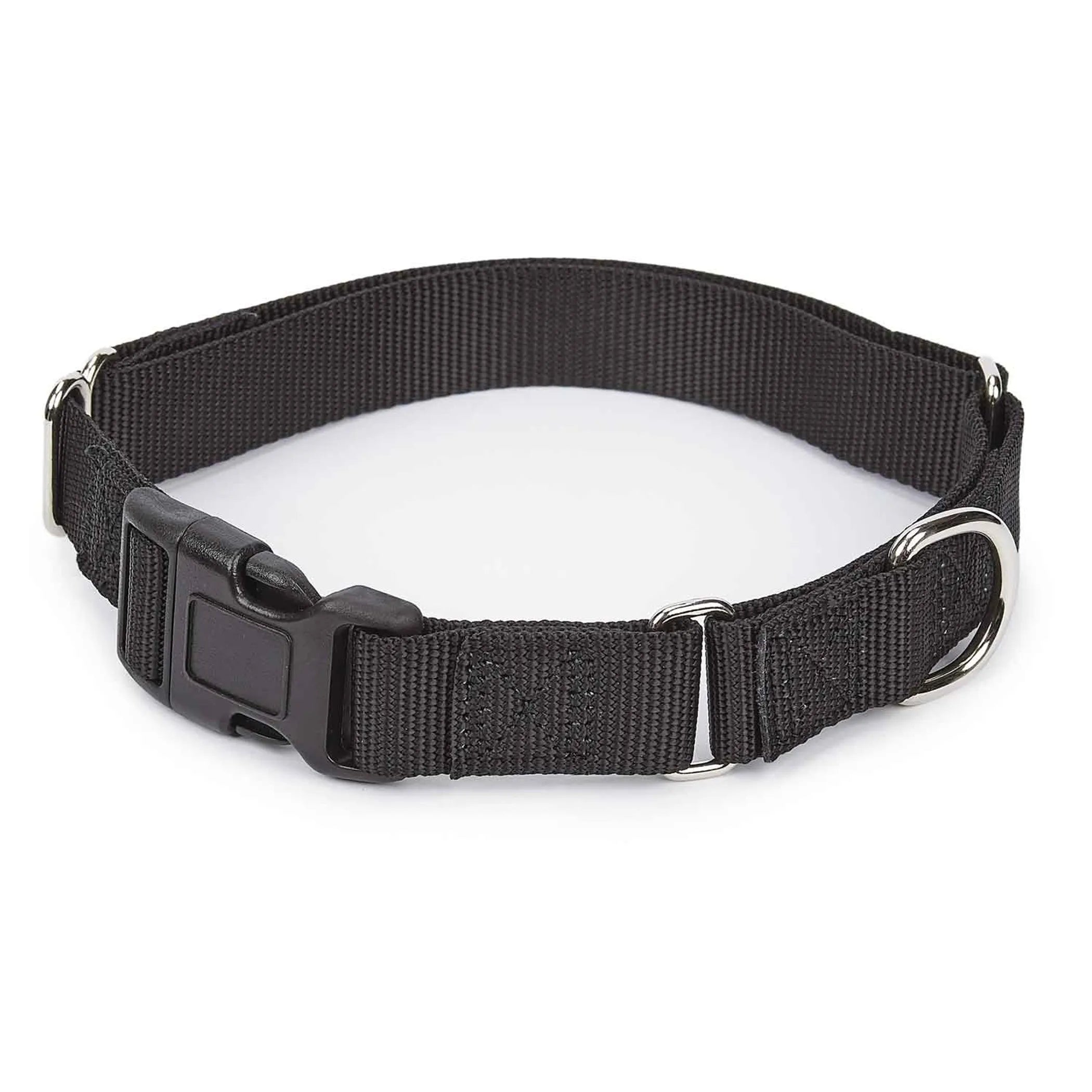 The Martingale design allows you to set a length beyond which collar cannot constrict around pet's neck. When tension is applied collar constricts evenly dispersing the pressure to prevent choking or injury. Durable Nylon material is comfortable in all types of weather. Convenient quick-release for off-lead adventures. Tightens when dog pulls but loosens up for a comfortable and not too tight fit. Great for training and everyday activities.