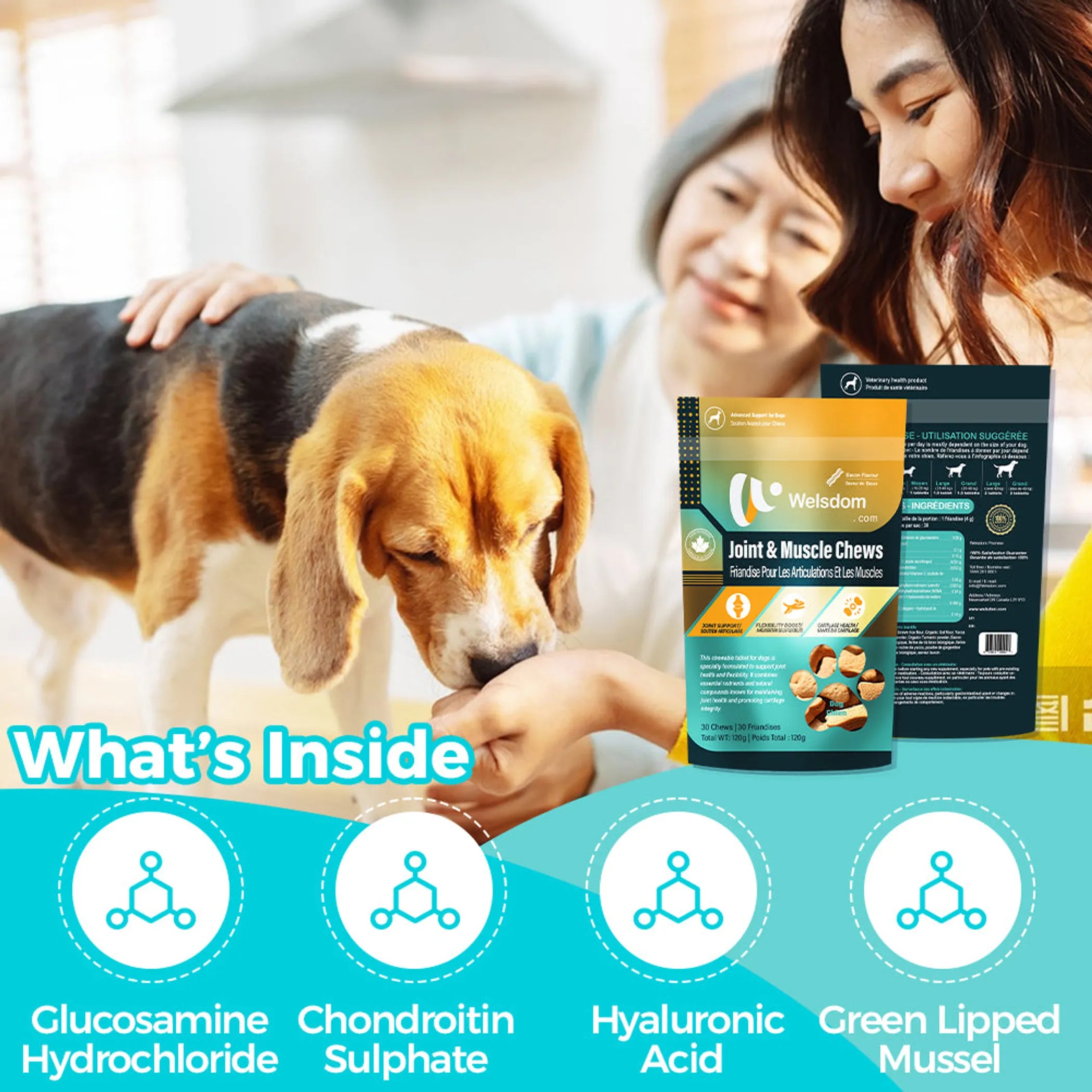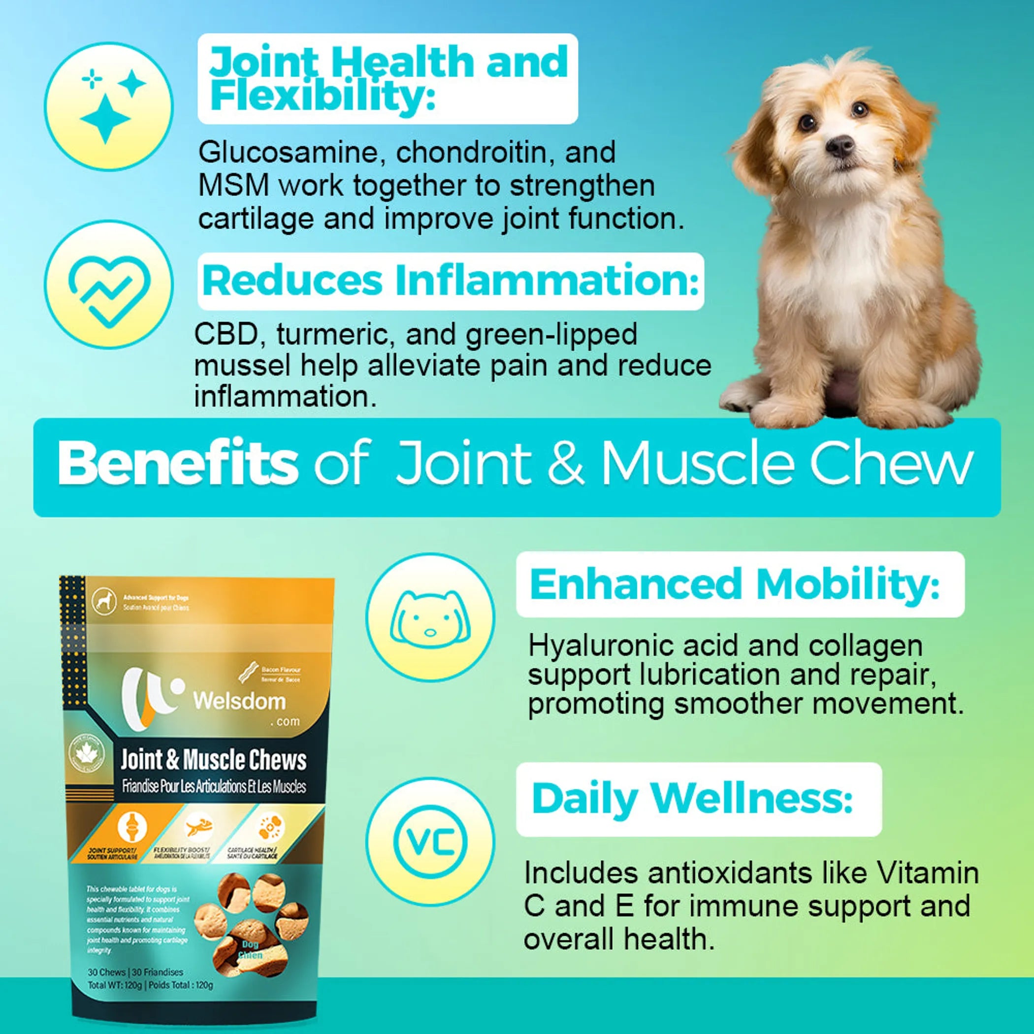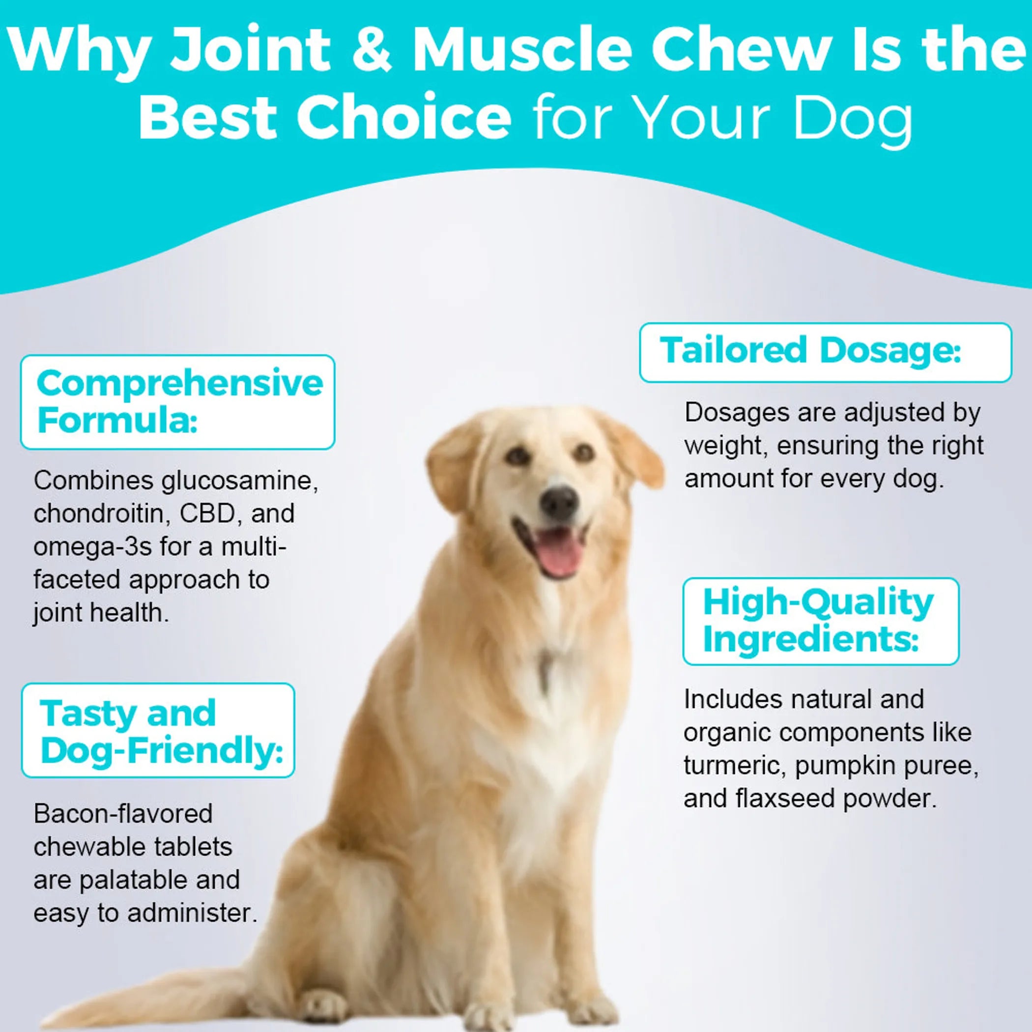 Introducing Joint & Muscle Chewable Tablets for Dogs, a meticulously formulated supplement designed to promote joint health, flexibility, and overall well-being in dogs. These chewable tablets combine essential nutrients and natural compounds, including Glucosamine, Chondroitin, and Fish Oil, known for their efficacy in maintaining joint health and promoting cartilage repair. With a palatable blend of ingredients, these tablets are easy to administer and are ideal for dogs of all sizes._x000D_ _x000D_ Advanced Joint Support_x000D_ Omega-Rich Formula_x000D_ Antioxidant Protection_x000D_ Natural Ingredients for Joint Lubrication