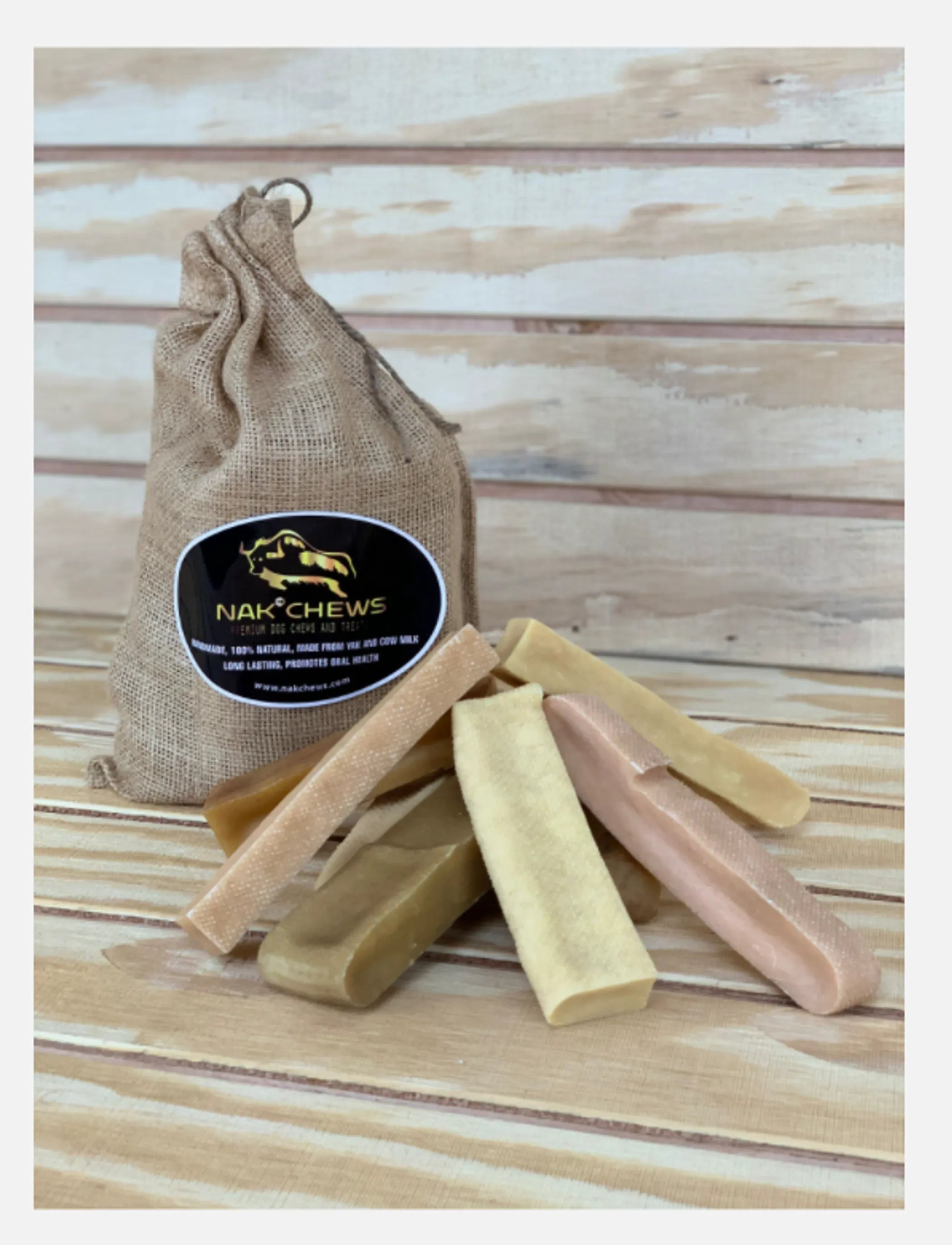 Nak Dog Chew is Hand Made from 100% Yak milk from The Himalayas which means yummier , Human -Grade, Easily Digestible , Smoky Flavor long lasting Dog Chew, Easily Digestible. No Preservatives, No Odor, No Staining, Help keeping your dog's mind Stimulated, Reduces Stress, Anxiety and Boredom. Trust Nak Dog Chew for best Customer Service and Canine Welfare. Small Dog Chew Pack made only from 100% Yak Milk 3 Pcs/7.4 Oz for Dogs weighing 20-80 Lbs. Nak Chew is a long lasting delicious smoky flavor dog chew made with 100% yak milk. The only ingredients used in our dog chews are yak milk, salt and lime juice. This recipe of making hard cheese has been used by the people of the Himalayas since ancient time which is still traditionally used for human consumption. Our Dog Chews are lactose and grain free, easy on tummy. Offering Nak Dog Chew to your dog helps her to scrape away plague and bacteria making sure that the dental hygiene is tip-top, it also helps to eliminate bad breath, swollen or irritated gums. It is also very helpful for teething puppies to relieve pain and stimulate the growth of teeth. Nutritional facts: Milk Protein (Min): 67.6% Moisture (Max): 9% Carbohydrates (Max): 0% Total Ash (Max): 6.1% Fat (Min): 0.9%