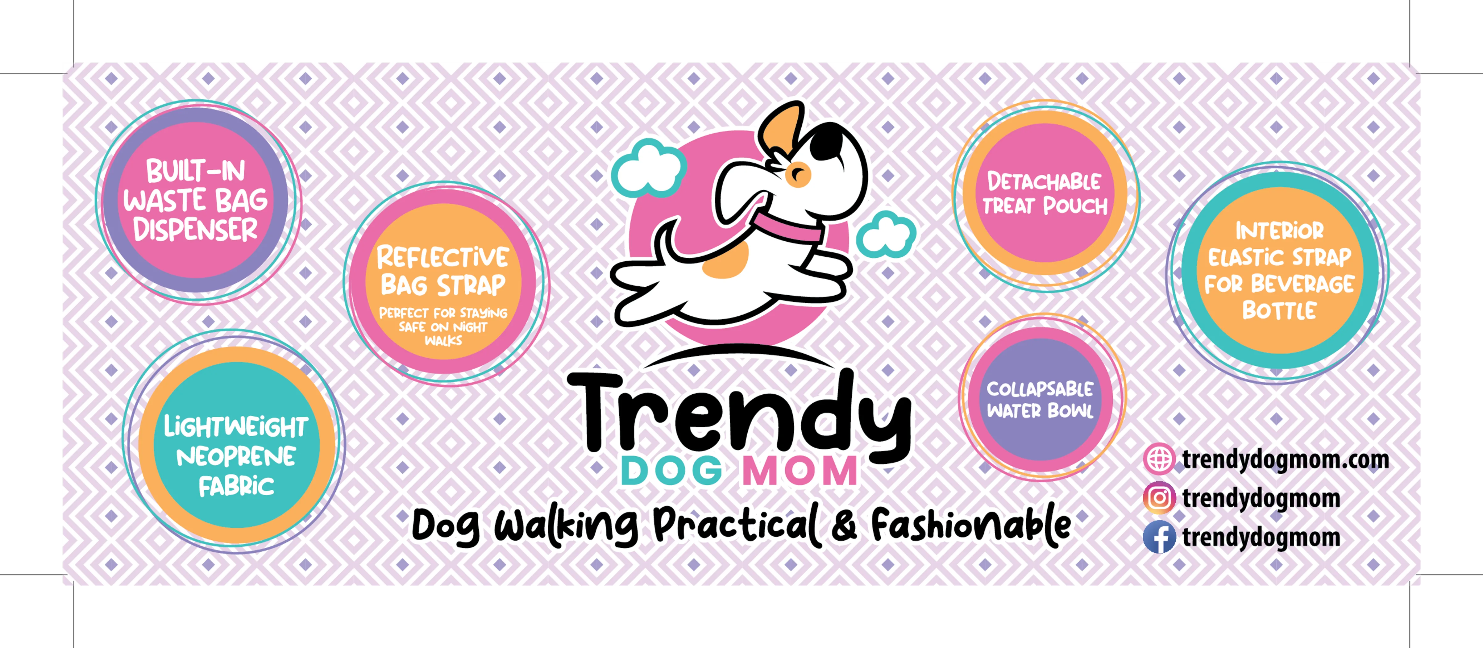 Be trendy, practical & fashionable while walking your beloved canine. Trendy Dog Mom bags are designed for the active dog-walker. Our bags have a built-in waste bag dispenser, matching collapsible dog bowl, treat pouch, internal beverage holder, and is made with a durable and lightweight neoprene fabric. Fashionable strap also included. Fun and whimsical design perfect for dog walks, daily errands and travel. Great gift for all dog lovers!