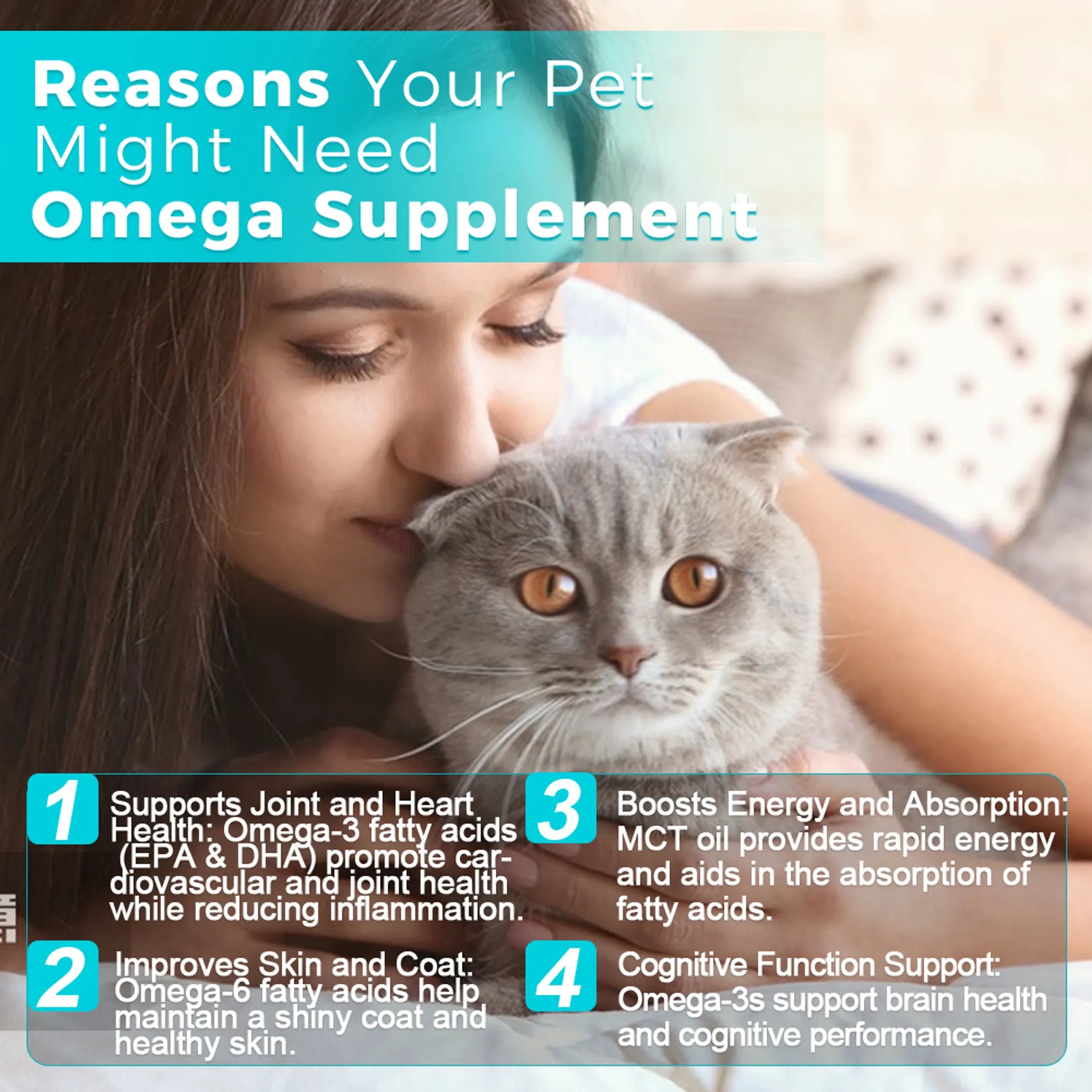 Introducing Omega Supplement Oil, a premium dietary supplement that leverages MCT oil as a carrier to deliver a concentrated blend of omega-3, omega-6, and omega-9 fatty acids derived from marine sources, fish oil, and hemp oil. MCT oil not only aids in the absorption of these essential fatty acids but also provides additional metabolic benefits, making it an excellent choice for supporting overall health and wellness in pets._x000D_ _x000D_ Dosage and Administration:_x000D_ _x000D_ Cats: 0.5 mL daily._x000D_ Small Dogs (up to 10kg): 0.5 mL daily._x000D_ Medium Dogs (10kg to 25kg): 1 mL daily._x000D_ Large Dogs (25kg and over): 2 mL daily._x000D_ _x000D_ Additional Instructions: Each full pipette holds 2 mL of the liquid supplement. For accurate dosing, simply fill the pipette to its maximum capacity (2 mL) and administer the appropriate amount as per your pet's weight and needs._x000D_ _x000D_ Comprehensive Omega Fatty Acid Blend_x000D_ High-Quality Marine and Plant-Based Sources_x000D_ Supports Metabolic Health_x000D_ Anti-Inflammatory Benefits_x000D_ Cardiovascular and Cognitive Support_x000D_ Palatable Flavor