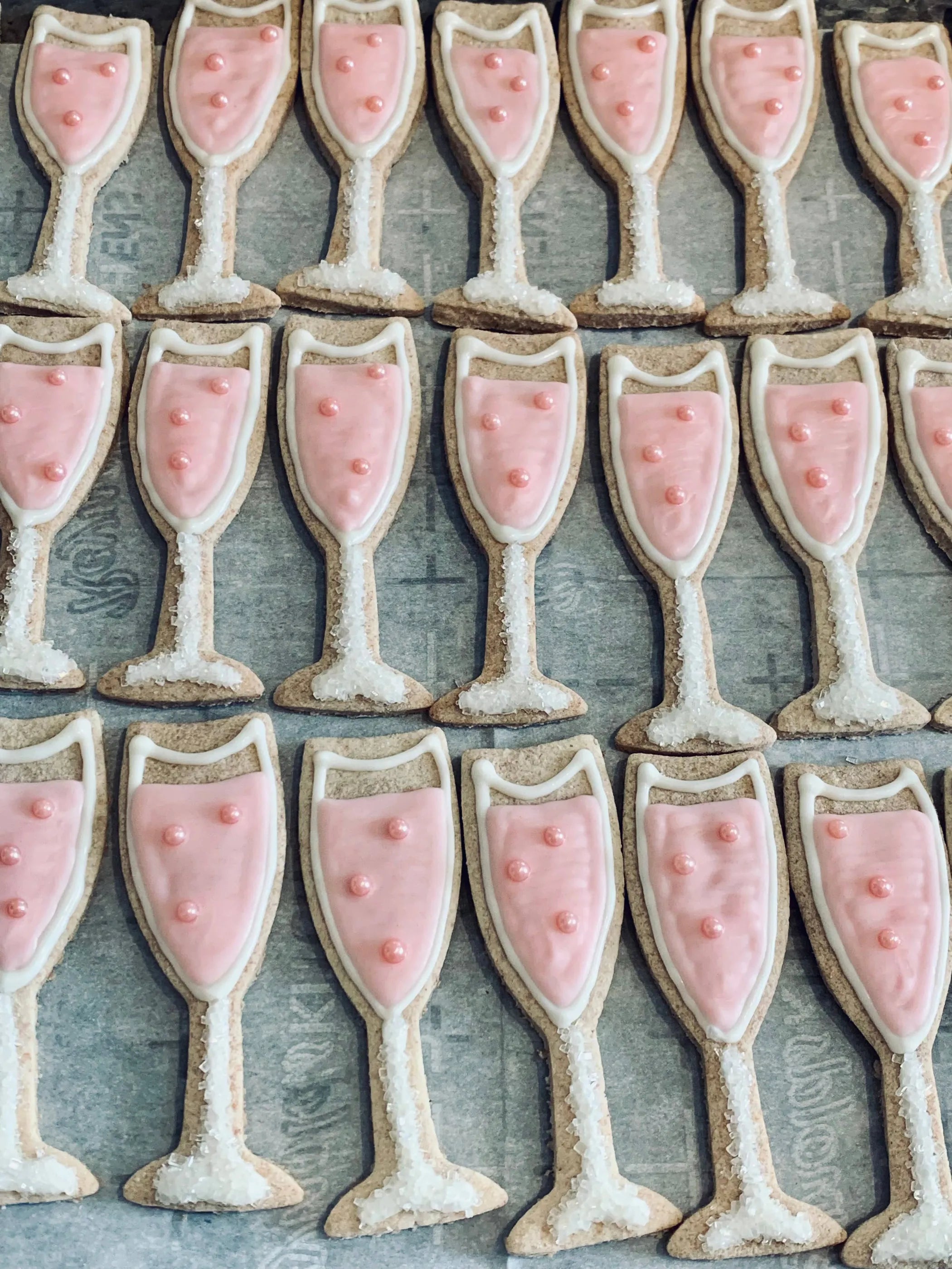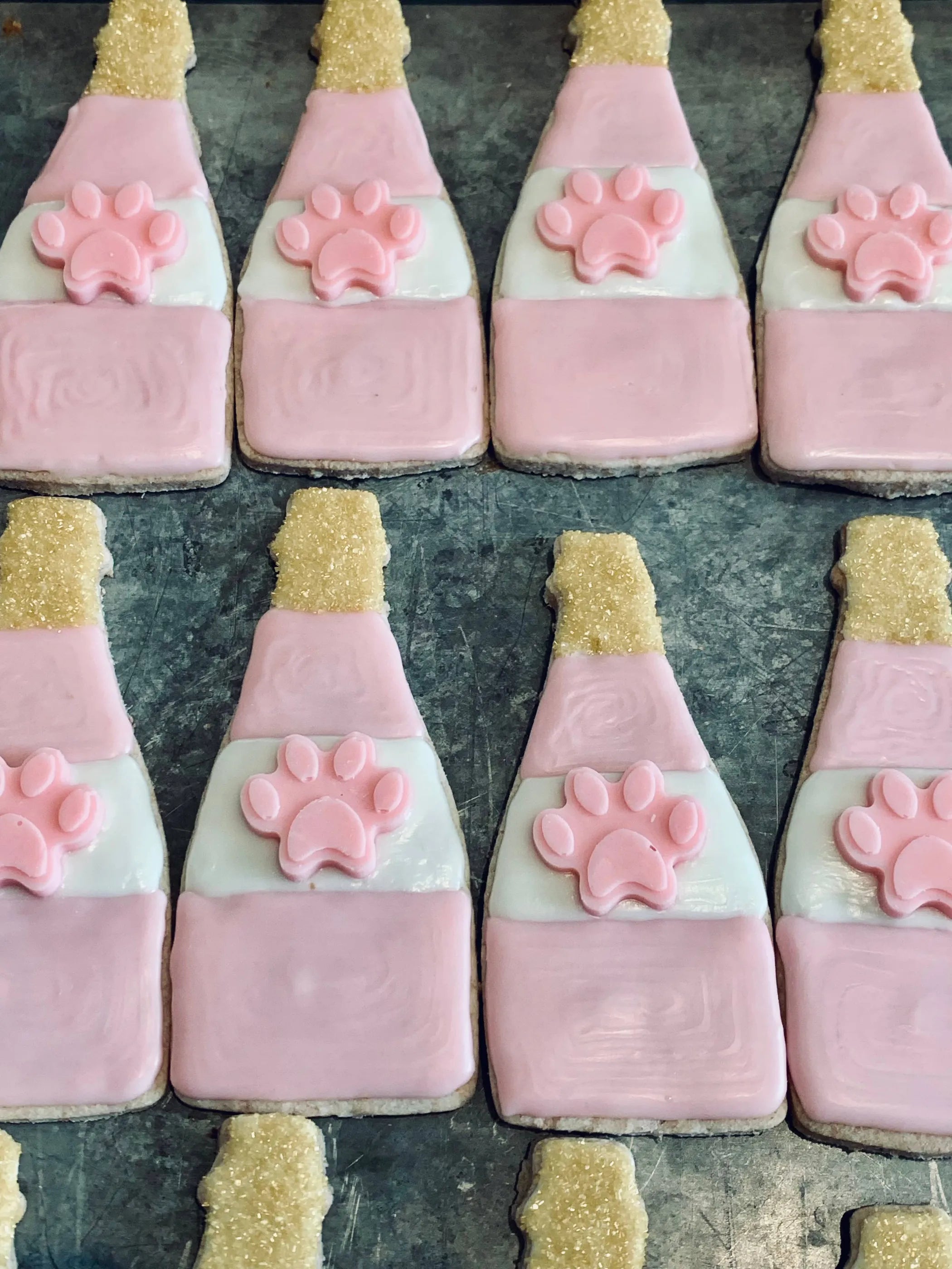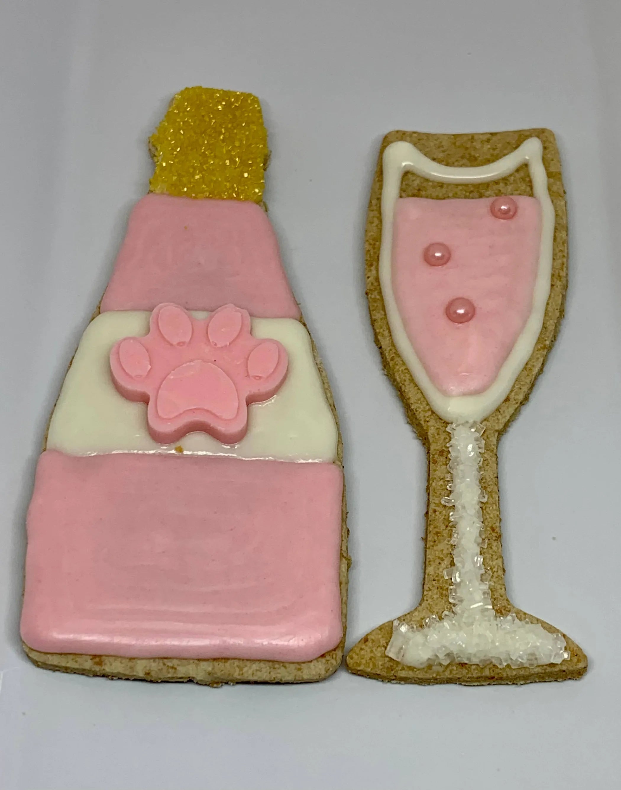 Vanilla cookies in the shape of a champagne bottle and glass. Bottle is 4.5 x 2 and the glass is 4.25 x 1.5. Both are decorated with pink vanilla icing. Bottle has gold sugar sprinkles on the bottle top and a cute pink vanilla paw print. Glass has white sugar sprinkles and a few pink bubble sprinkle balls.