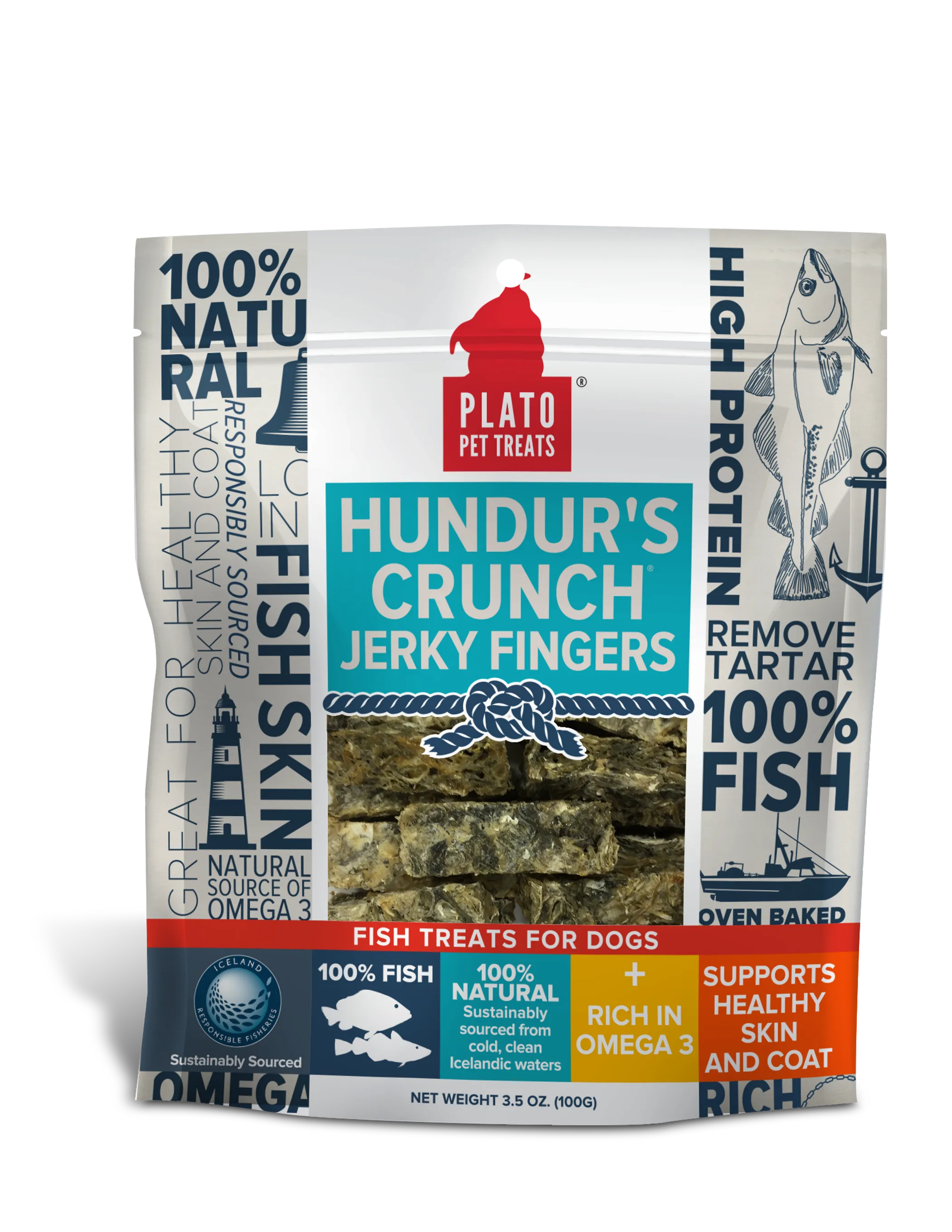 - 1-ingredient codfish skin jerky treats to reward your pup.