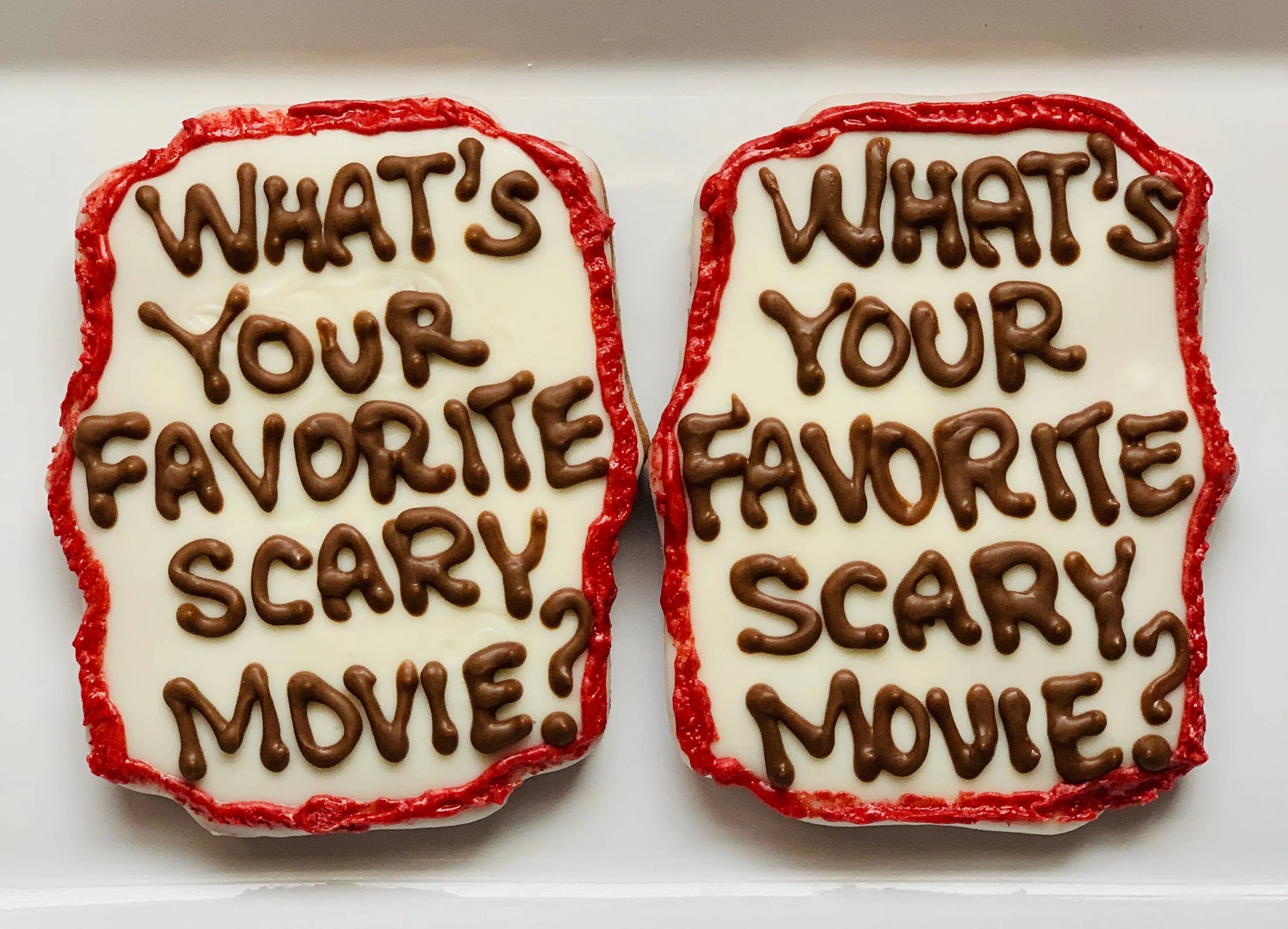 Ring, ring.....hello? How fun is this hat tip to the movie Scream...a crunchy carob cookie decorated with red and white vanilla icing and asking What is your favorite scary movie in carob icing.