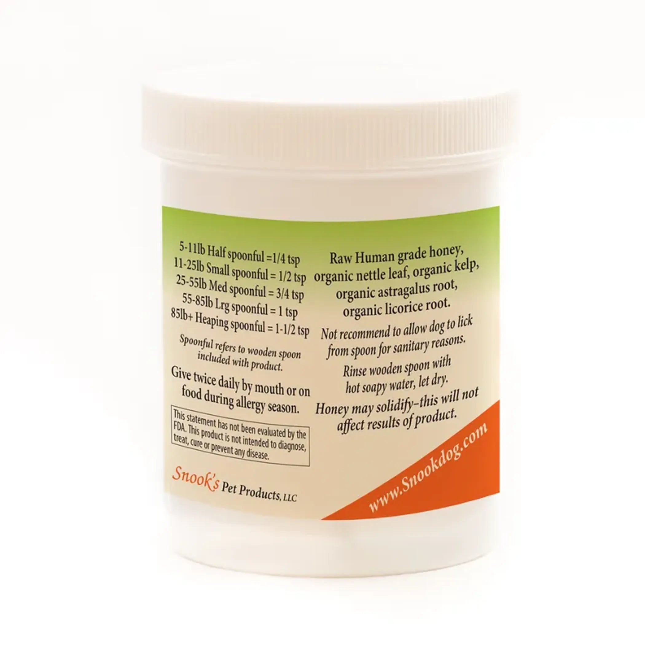 Snook's Green Honey Allergy Support - is a blend of Raw Honey, Organic Nettle Leaves, Organic Kelp, Organic Licorice Root, Organic Astragalus Root. Helps relieve allergy symptoms caused by pollens and grasses. Available in 6oz.