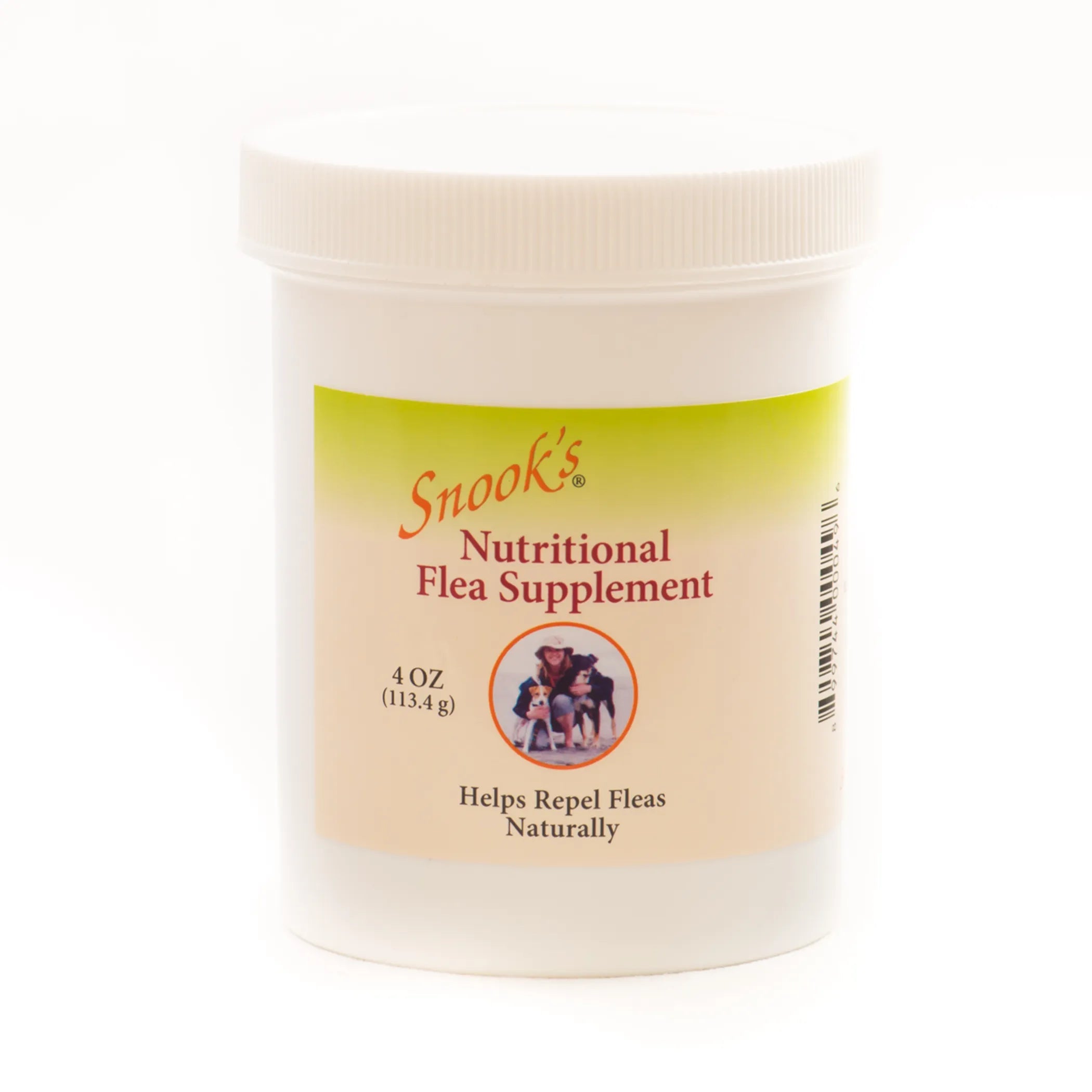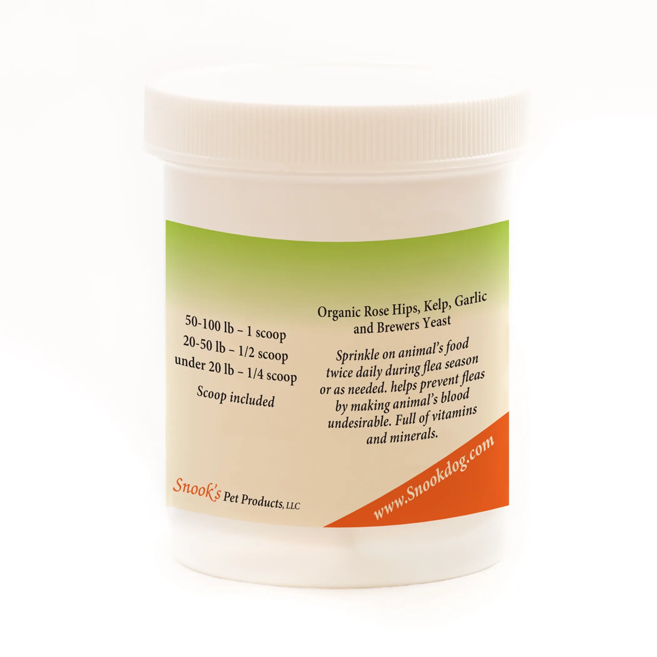 Snook's Nutritional Flea Supplement - A blend of Organic Rose Hips, Kelp, Garlic and Brewers Yeast. Helps make dogs blood intolerable to fleas and has many nutritional benefits for your pet. Available in 2oz and 4oz sizes.