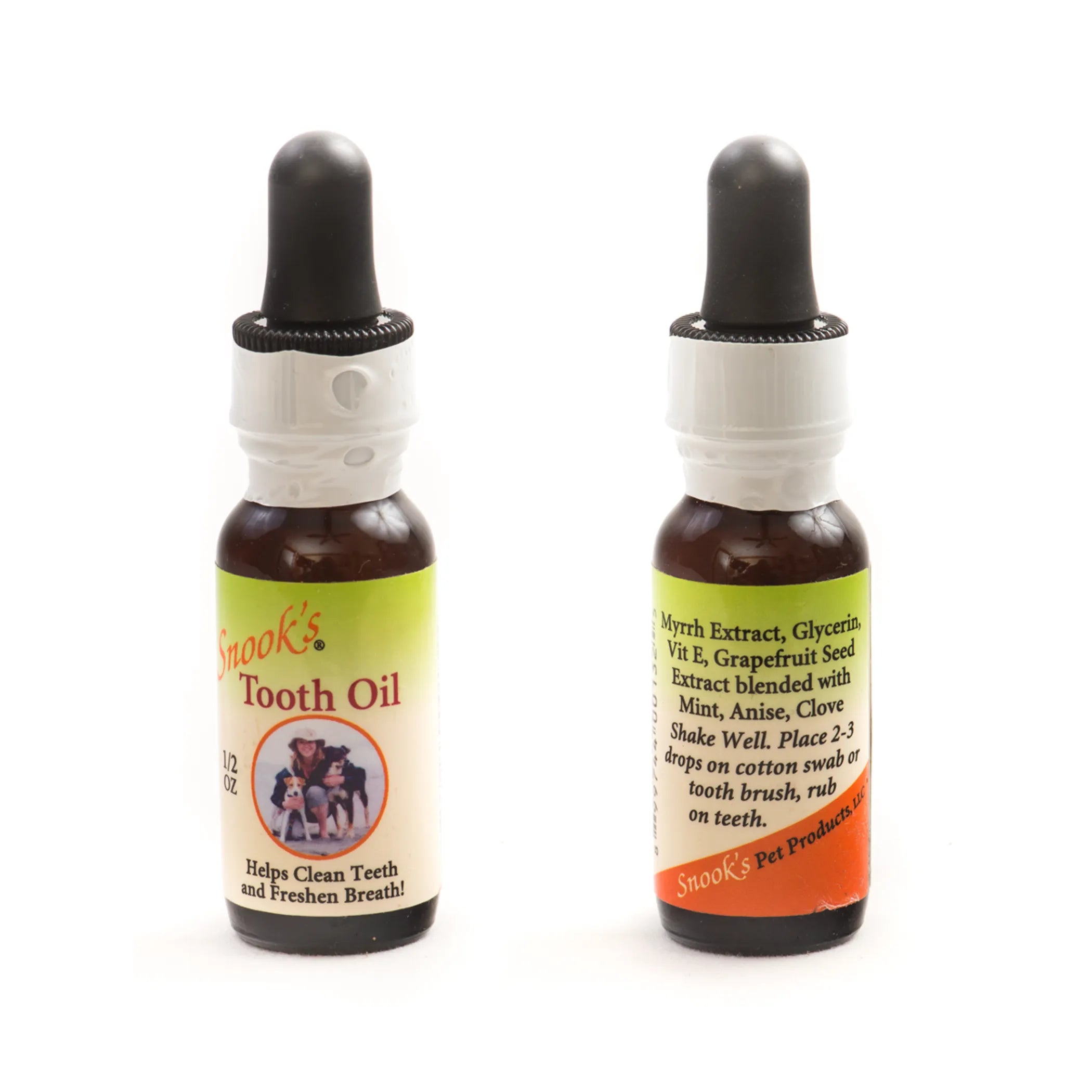 Snook's Tooth Oil - Food Grade Myrrh Extract, Food Grade essential oils of Anise, Spearmint, Clove and Vit E blended in a Vegetable Glycerin Base. Rub on teeth and gums to soften and remove tarter. Apply with doggie tooth brush or cotton swab then give hard healthy treat (we recommend Snook's Sweet Potato Dog Chips or Chews) to help remove build up. Helps keep teeth and gums healthy and clean. Helps freshen breath.