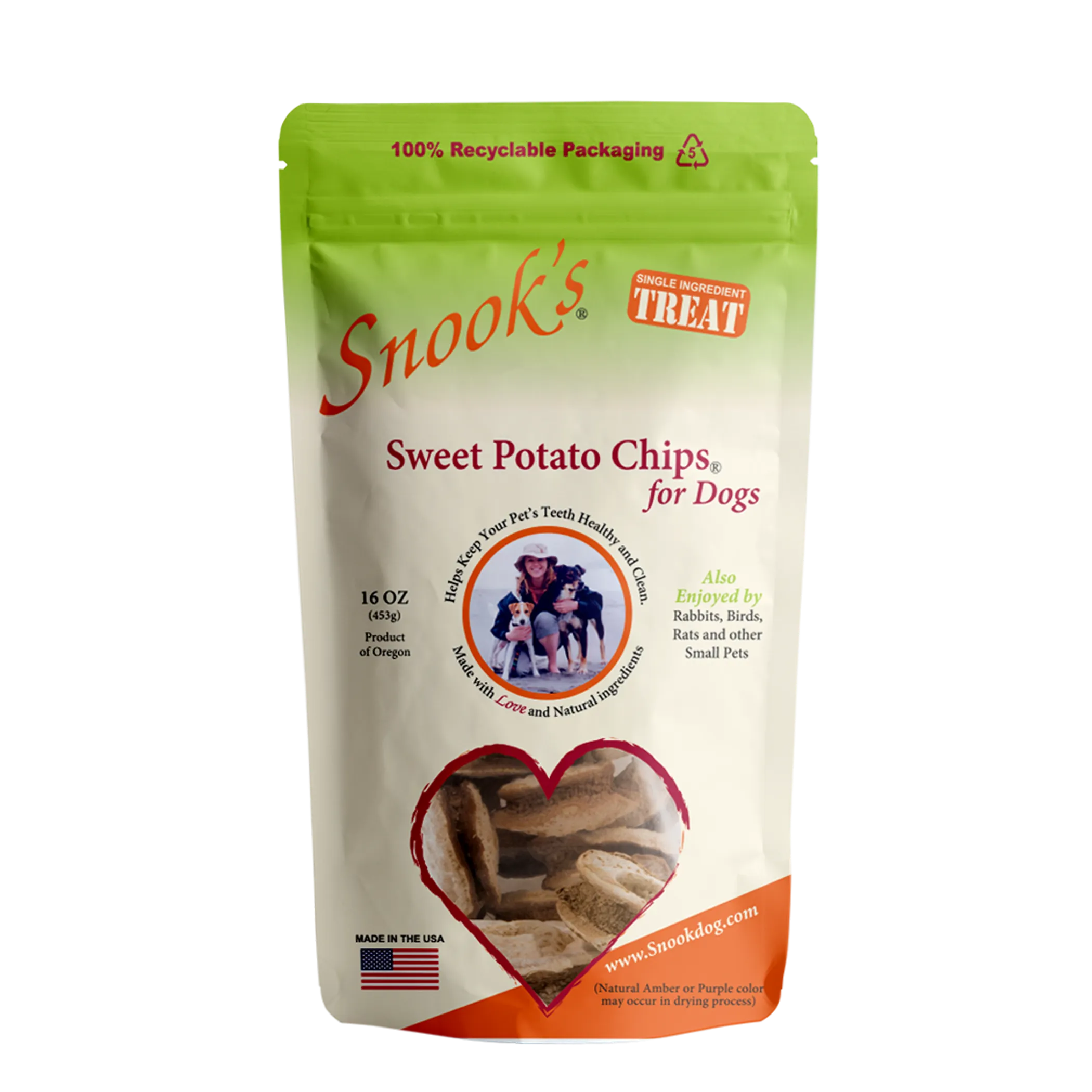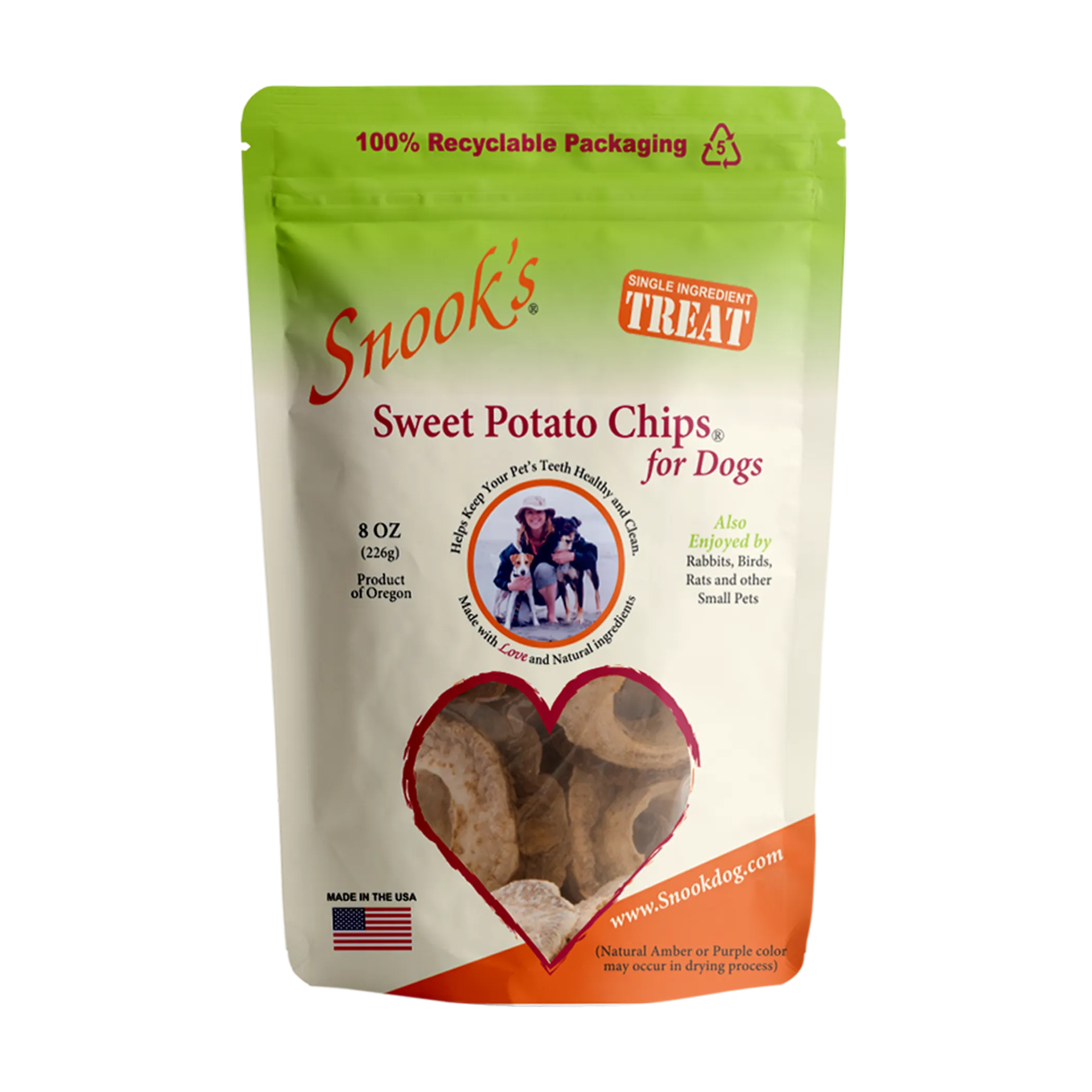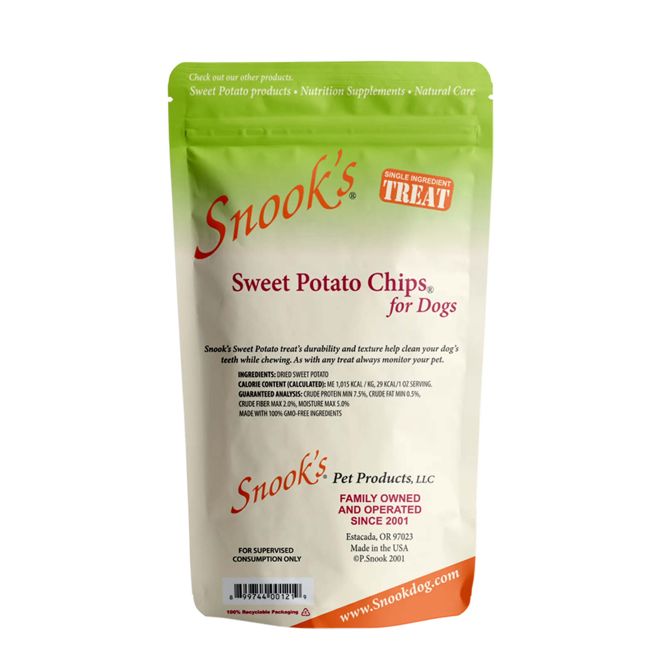 Snook's Sweet Potato Dog Chips are made from GMO Free Dried Golden Sweet Potatoes.