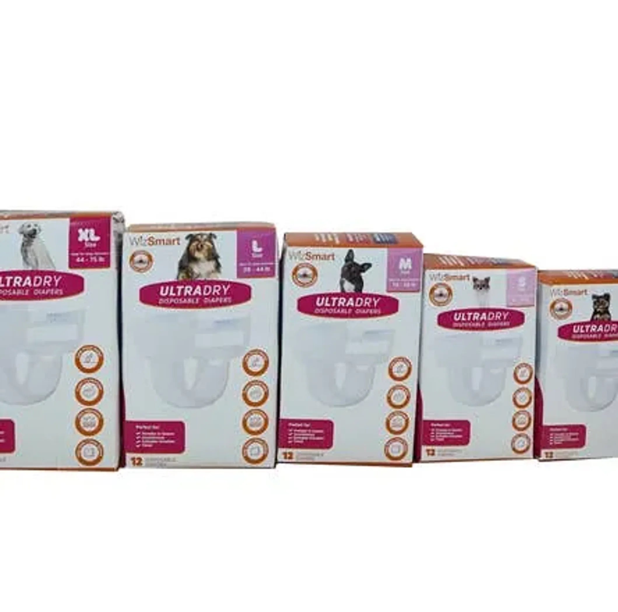 WizSmart's NEW Ultradry Disposable Diapers feature a super comfortable fit with tail hole, easy open/close system, and ultra absorbent materials! Our leak-proof diaper design is perfect for females in season, incontinence, excitable urination, travel, and more. Size XS ideal for dogs < 8lbs with a 8-13" waist Size S ideal for dogs 8-14lbs with a 11-18" waist Size M ideal for dogs14-28lbs with a 14-23" waist Size L ideal for dogs 28-44lbs with a 15-26" waist Size XL ideal for dogs 44-75lbs with a 17-29" waist
